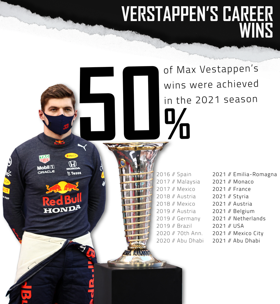 据Reddit网友统计,维斯塔潘至今一半的F1分站冠军数都来自于今年。