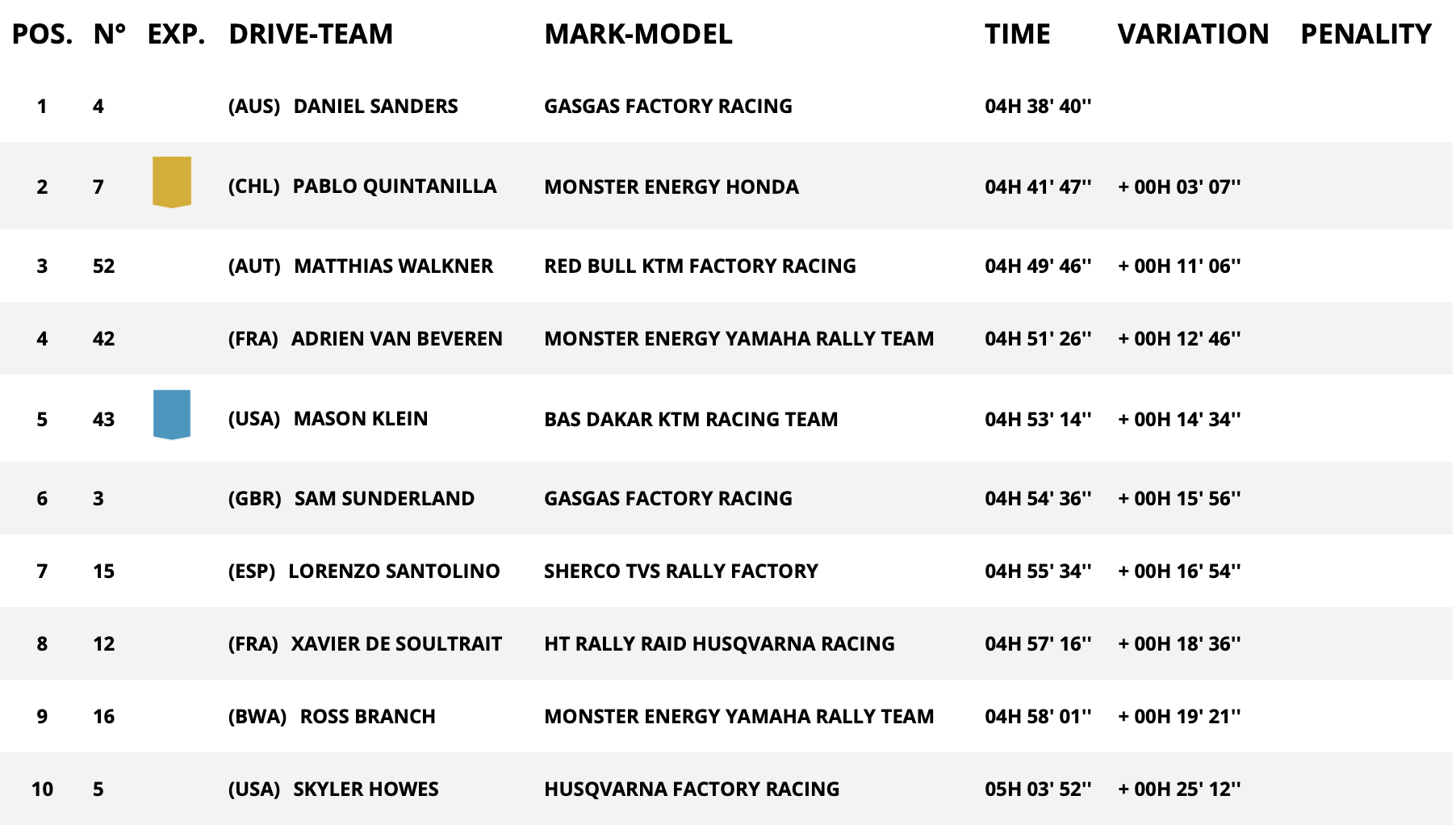 在首日比赛中取得第一后,GasGas车手桑德斯今天发挥依旧稳定,以4小时38分40秒的成绩完赛,排名第一。老将金塔尼拉和沃克纳排在二三位。去年的卫冕冠军贝纳维德斯仅排第20。