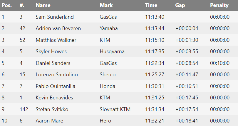总成绩方面,GasGas车队的桑德兰(Sam Sunderland)依旧保持领先,但排在第二位的雅马哈车手范贝夫林(Adrien van Beveren)仅落后4秒。第三位的KTM车手沃克纳(Matthias Walkner)也只落后1分30秒。