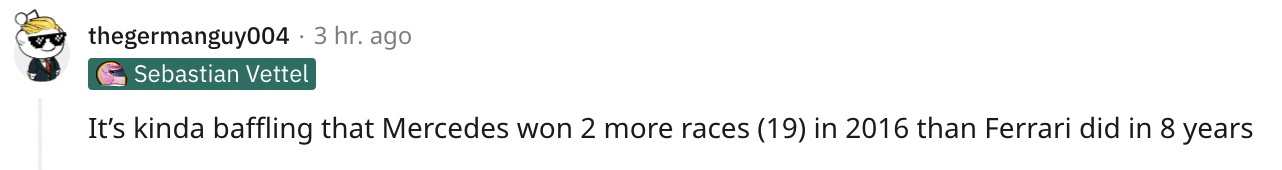 还有网友挖出了有趣的数据。梅赛德斯2016年赢得的冠军数,比法拉利8年来加起来还多2个。