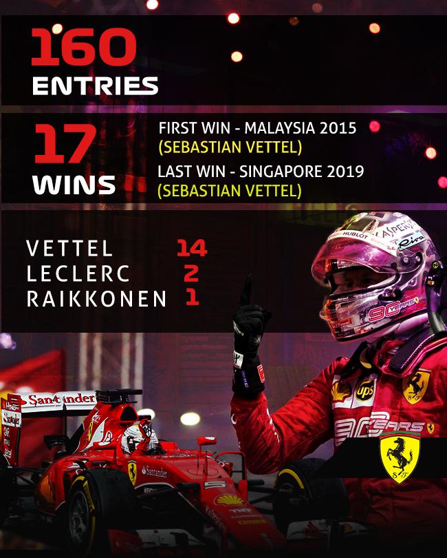混动时代以来,法拉利第一次获胜是维特尔2015年在马来西亚的胜利,最后一次胜利也由维特尔创造,在2019年的新加坡。