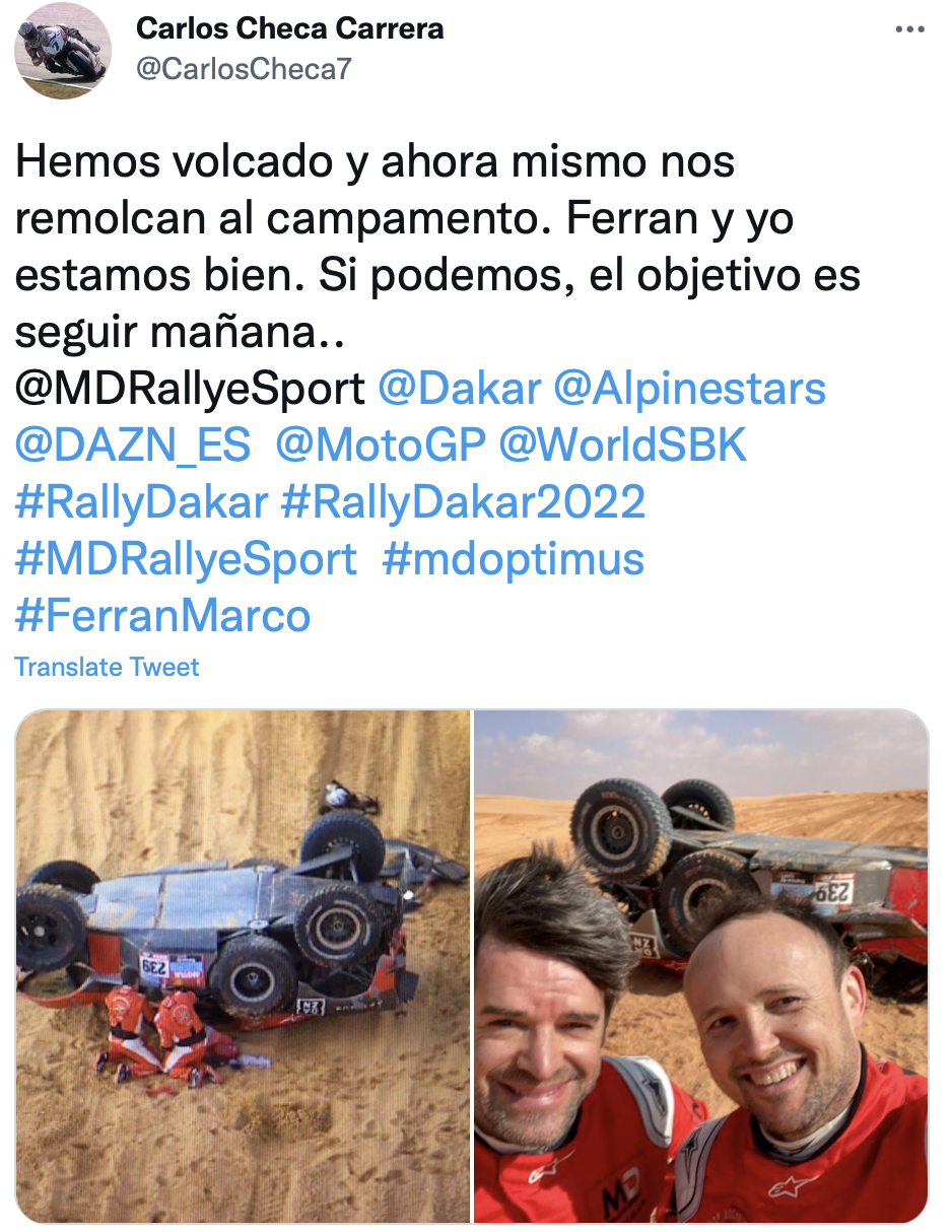 在2022达喀尔拉力赛第三赛段比赛中,卡洛斯·切卡遭遇翻车事故,他在社交媒体上放出车辆的最新状况。可以看出,车辆外观已经受损严重,还需进一步检修才知道内部是否有损坏。车手也在视频下配文称:“正在发愁还能不能修好。”