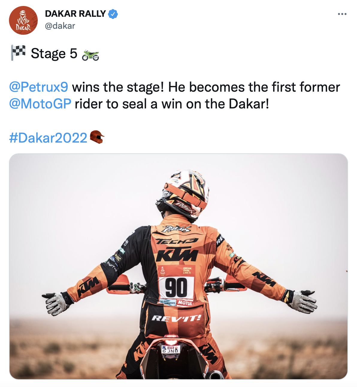 在今天进行的达喀尔拉力赛第五赛段比赛中,原本排在第一的普莱斯因超速被罚6分钟,因此佩特鲁奇排名升至第一,他也成为历史上首位赢得达喀尔赛段冠军的MotoGP车手!