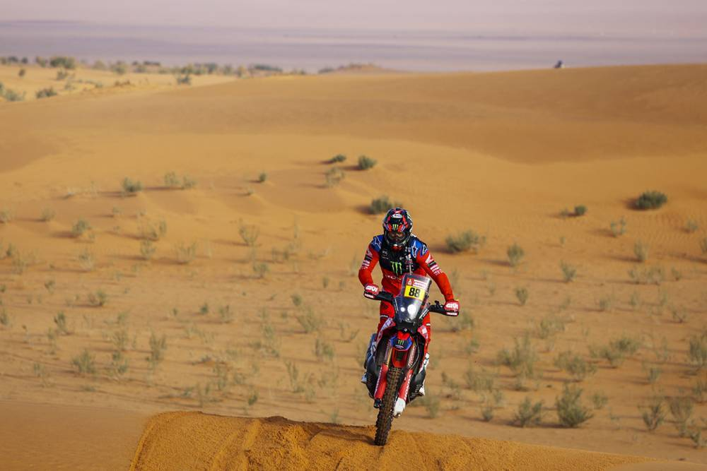 进入最后100公里时仍然处于领先位置的GasGas车手桑德斯却在最后阶段错过了一个计时点,被迫折返的澳大利亚车手损失了超过10分钟。而同样损失超过10分钟的还有今天前四发车的车手,昨天的赛段胜者巴瑞德更是损失了多达17分钟。西班牙人在过河时撞上了石头,随后摔车导致肩膀受伤,还不确定他是否能够继续参赛。