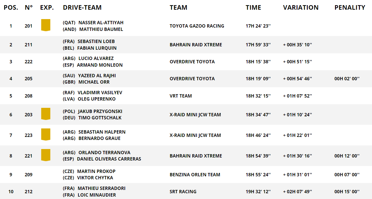 Mini车手西埃丹在今天翻车,随后赛车还出现着火情况。赶到现场的阿尔拉吉帮助西埃丹和领航员离开了赛车,而沙特车手损失的11分钟也被赛会去除,最终阿尔拉吉获得赛段第15。