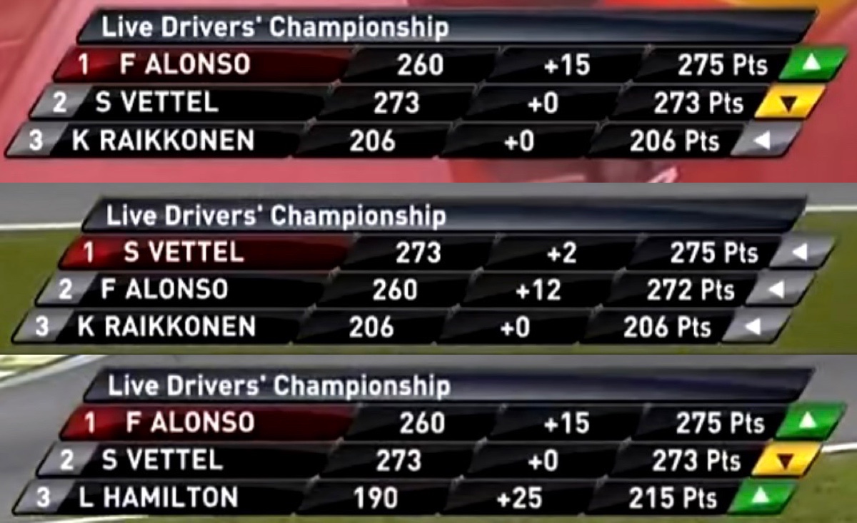 多事的转播方更是一次次更新两人积分变化。红牛和法拉利车队的员工,以及所有观众的心情,就像这些箭头一样忽上忽下。