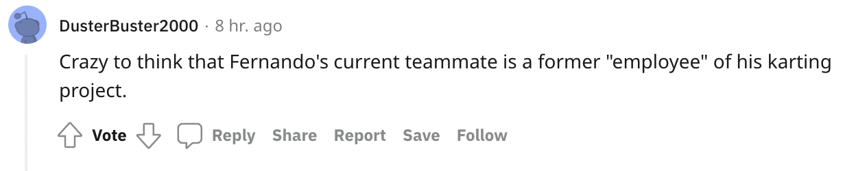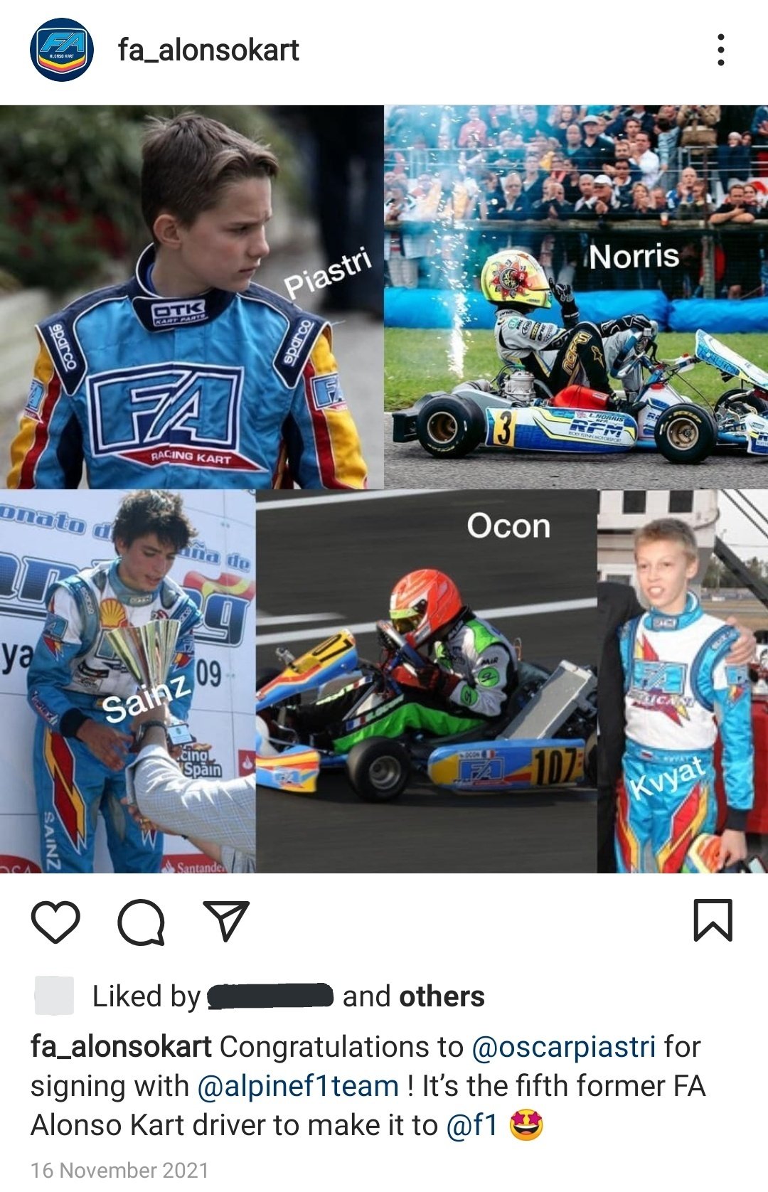 Reddit网友发现,阿隆索卡丁车学校共培养出了五位成功进入F1的正式车手和试车手。