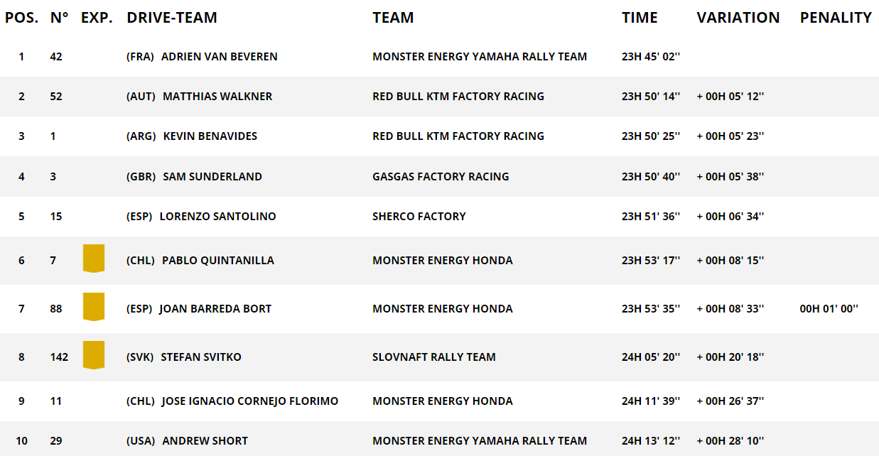 沃克纳也丢失20多分钟的情况下,此前位列总成绩第四的雅马哈车手范贝弗伦一举上升到了领跑位置,不过前七都只差不到9分钟而已,竞争十分激烈。
