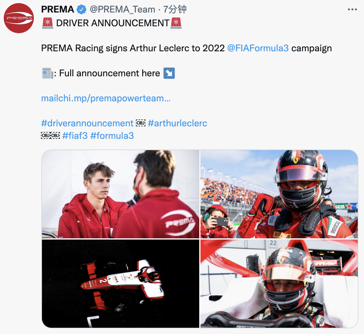 刚刚,Prema车队宣布阿图尔·勒克莱尔(Arthur Leclerc)将代表车队参加F3 2022赛季的比赛。阿图尔·勒克莱尔是F1车手夏尔·勒克莱尔的弟弟。