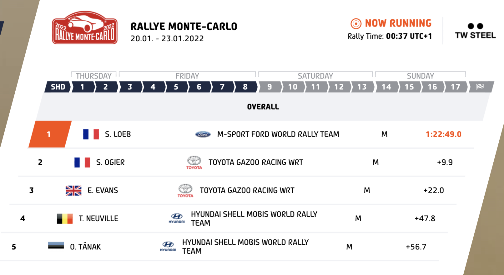 2022赛季的世界拉力锦标赛(WRC)揭幕战蒙特卡洛拉力赛于1月21日进行了第三到八赛段的比赛。传奇拉力车手塞巴斯蒂安·勒布取得领先。这也让48岁的他成为了历史上年纪最大的领先WRC的车手。