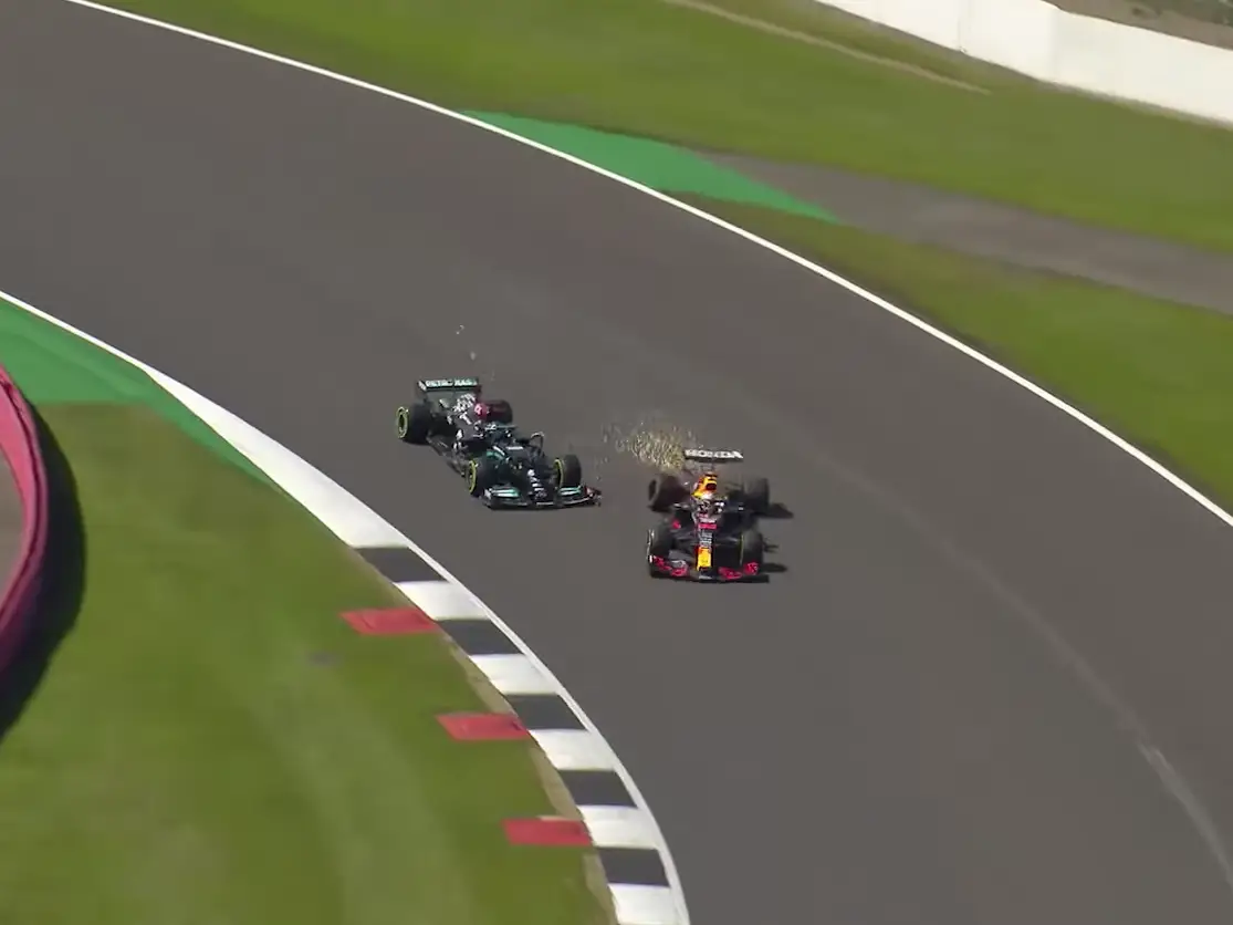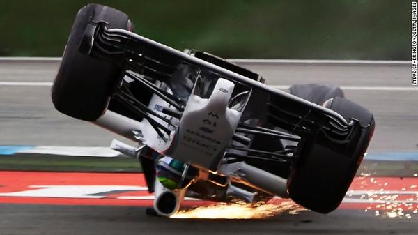 然而,F1最快的英国银石Copse弯角半径也才440m,因此,即使是很容易拐弯的弯角,赛车依然只能撞墙。
