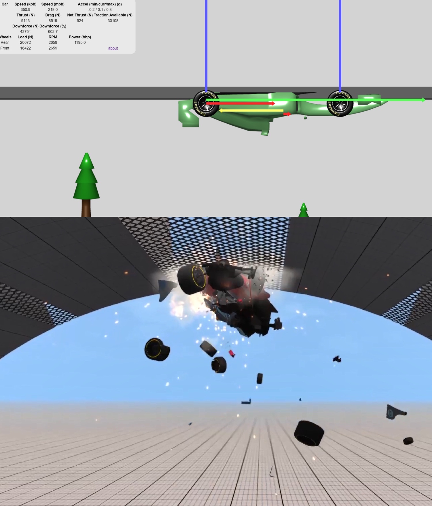 模拟器里,车在天花板上稳如老狗,我们能通过半径为249.5米的弯角,因此比利时SPA的Pouhon弯角可能会有希望,但依然不能去碰意大利蒙扎的Parabolica弯。