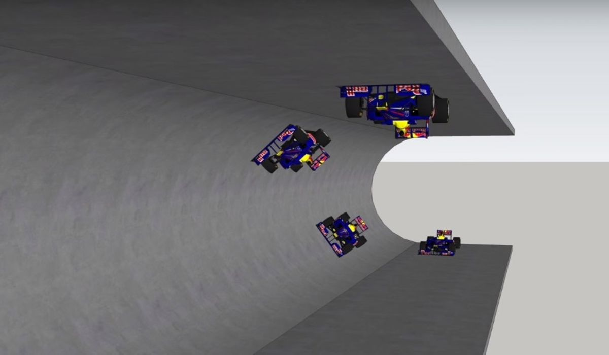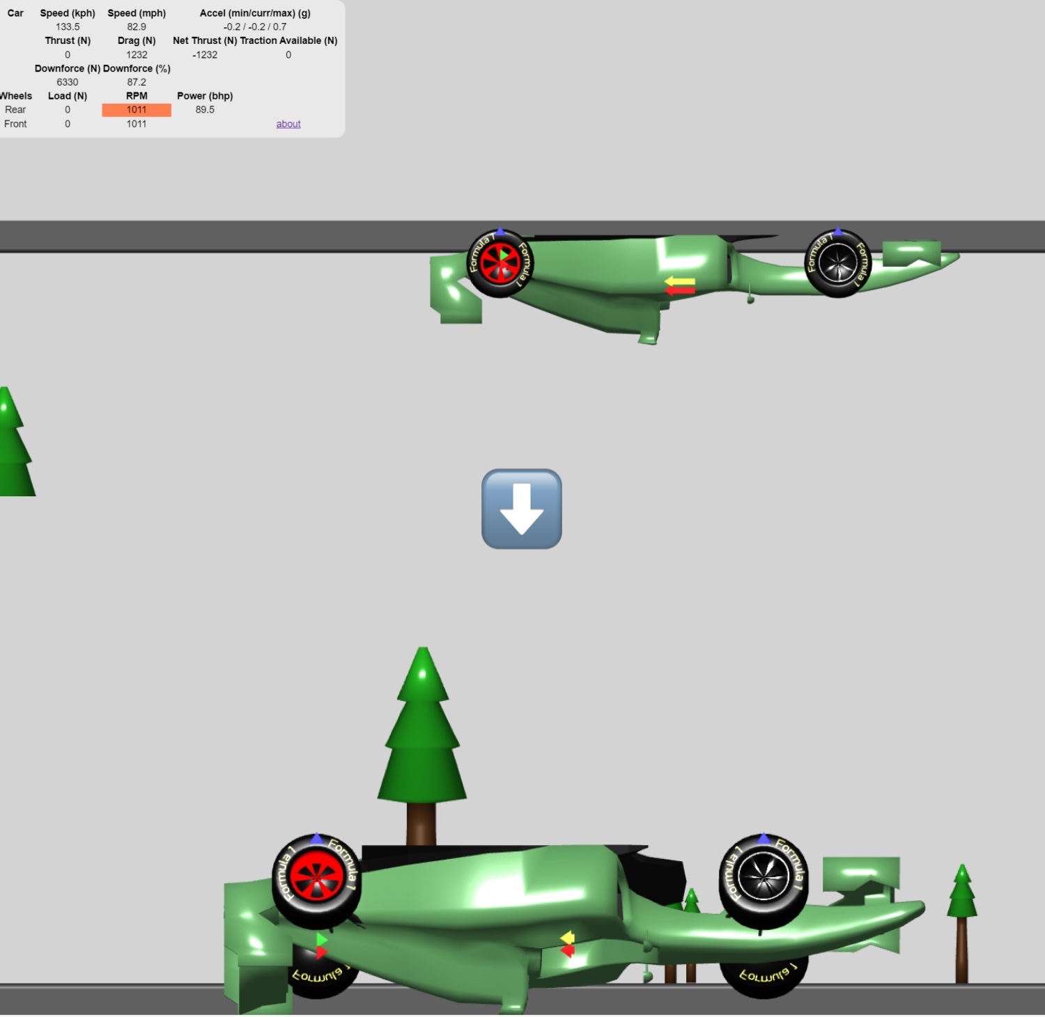 需要注意的是,这时候的速度已经超过了任何F1赛道最慢和次慢弯角的速度了,因此在赛道上贴着天花板开根本无法实现,何况这时还没有任何转向抓地可言。