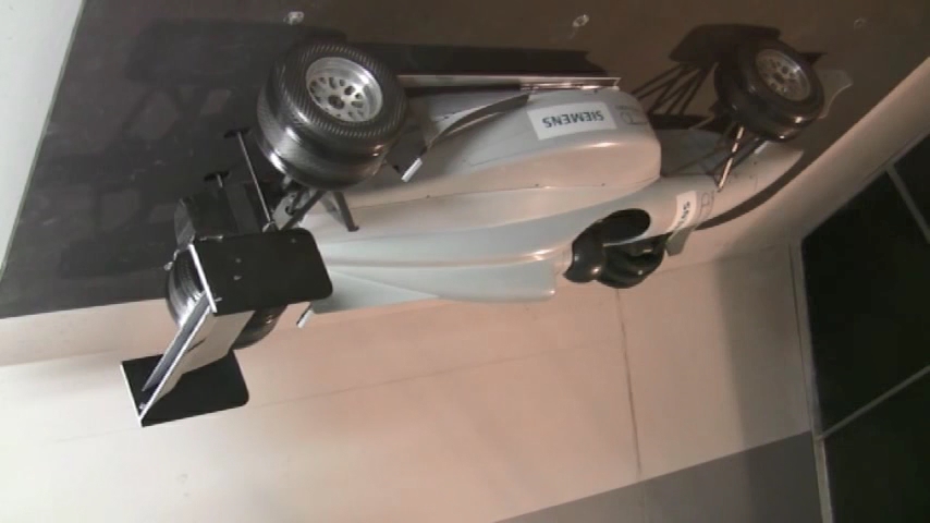 如果我们让下压力等于重力,赛车就刚好能贴上天花板了。8年前在风洞实验室就做过类似的实验,把40%大小的F1模型通过可伸缩的挂杆挂到天花板上,然后放到风洞实验室里,当风速加到150km/h时候车就贴到了天花板上,挂杆无需提供支持力。