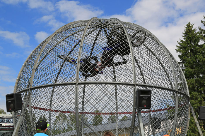 只要速度和半径都在理想状态下,离心运动并非难事,比如我们拉着绳转球可以向上飞转一圈,马戏团的摩托车可以在笼子里随意倒着跑。