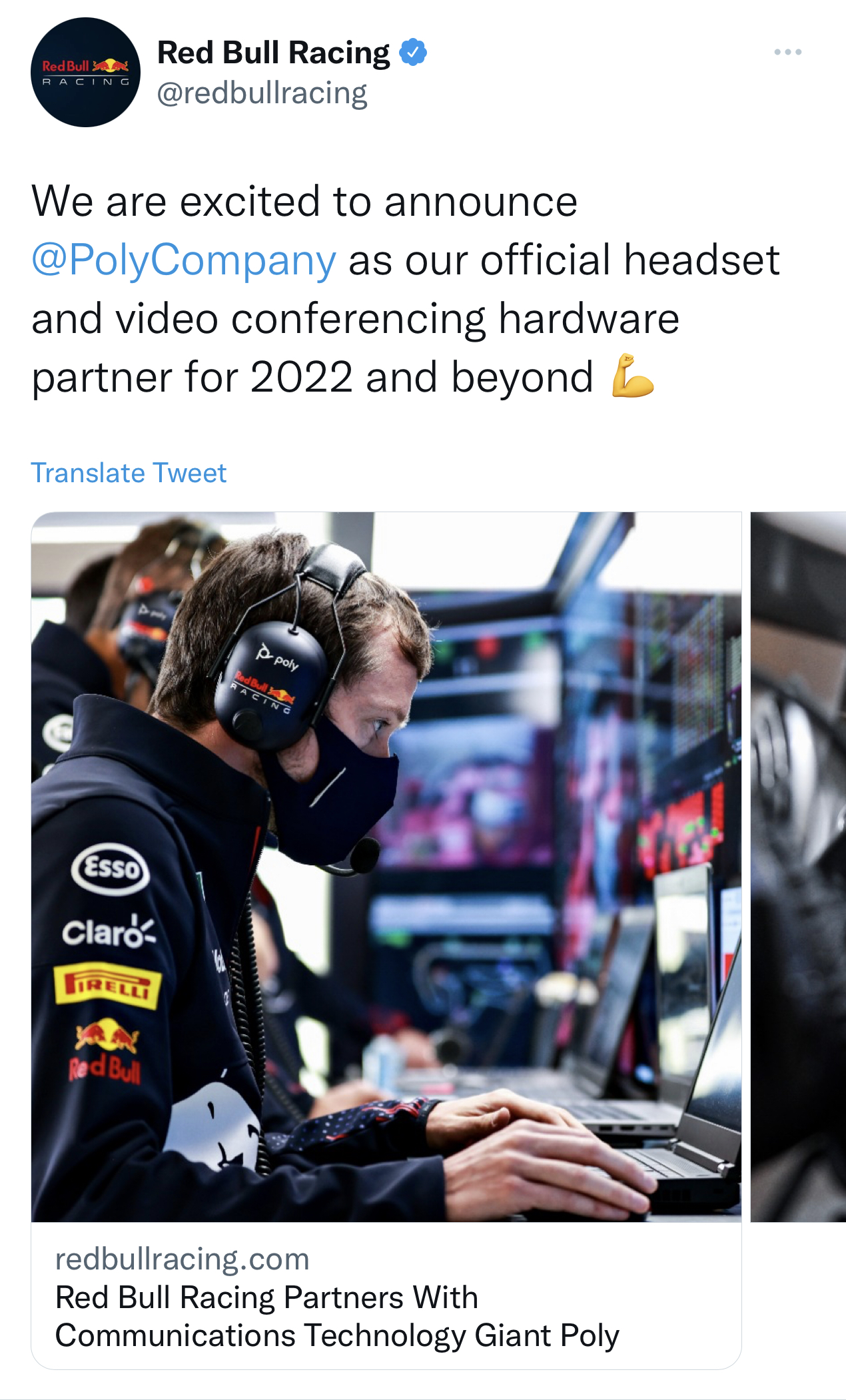 红牛车队官方宣布Poly公司将在下赛季成为车队耳机以及视频会议方面的赞助商。