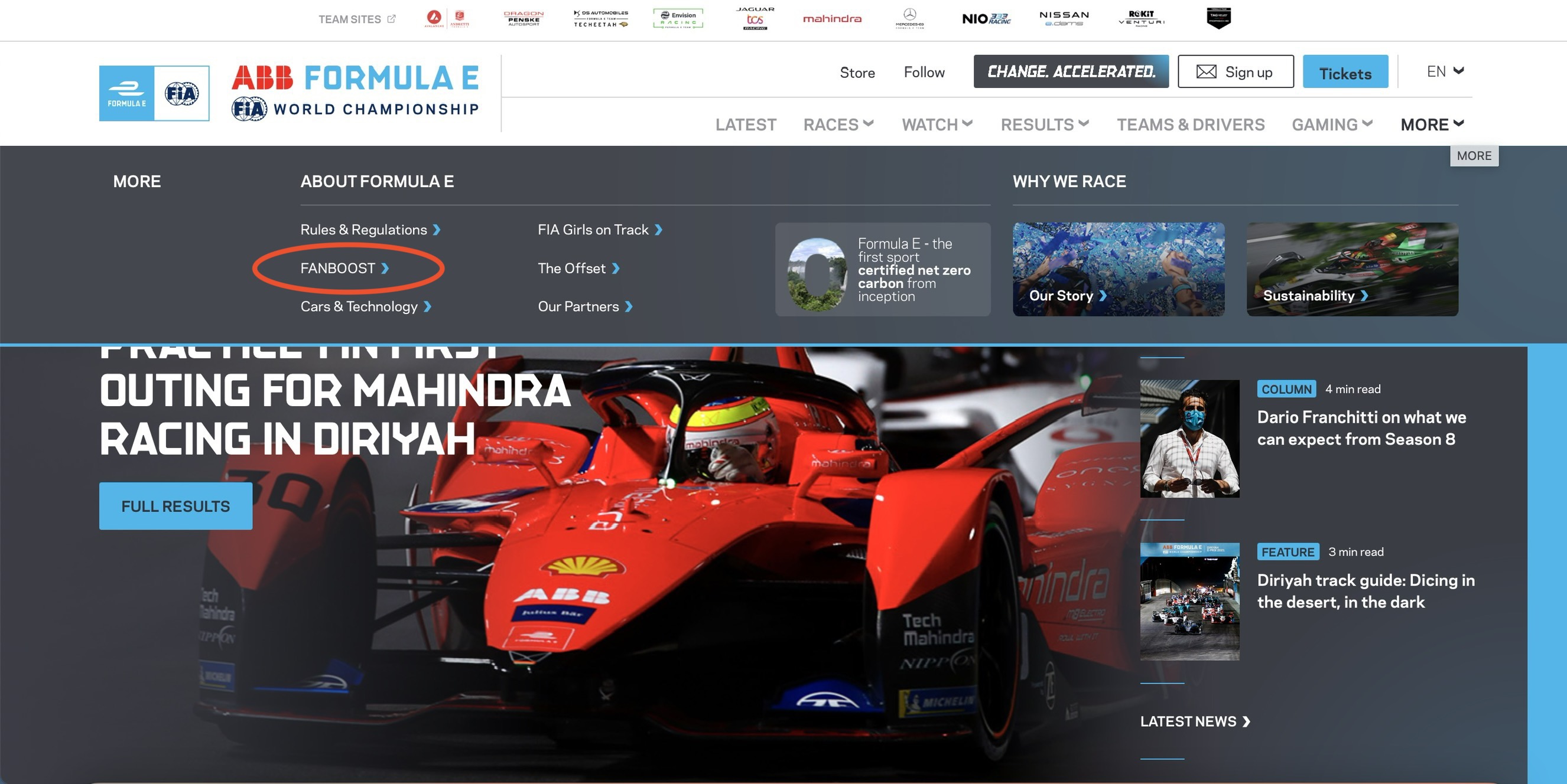 Fanboost的投票是在电动方程式官网进行的,进入官网后,从最上方“MORE”一栏里找到Fanboost投票入口,点击进入。