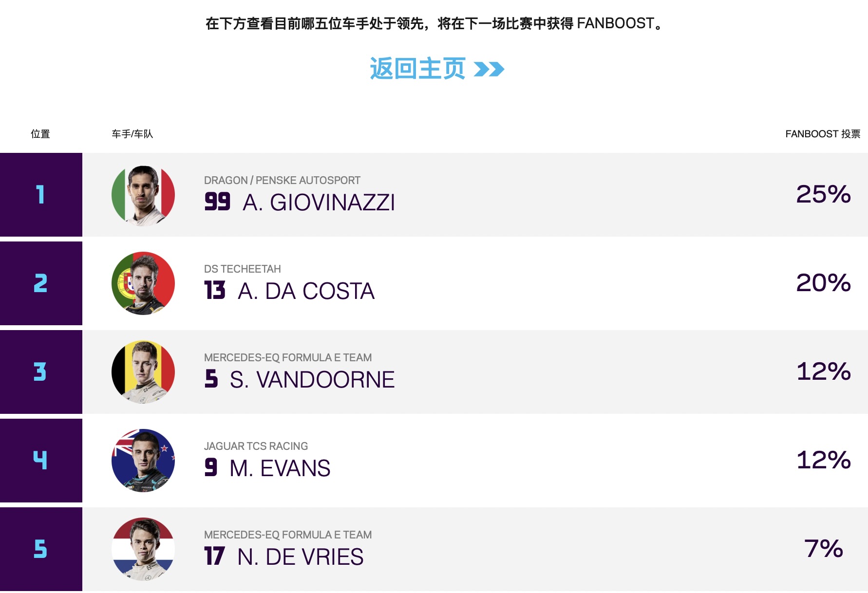 截止发稿前,排在揭幕战Fanboost榜前五位的是刚从F1转会的吉奥维纳兹、达科斯塔、“Fanboost小王子”范多恩、埃文斯以及卫冕冠军德弗里斯。