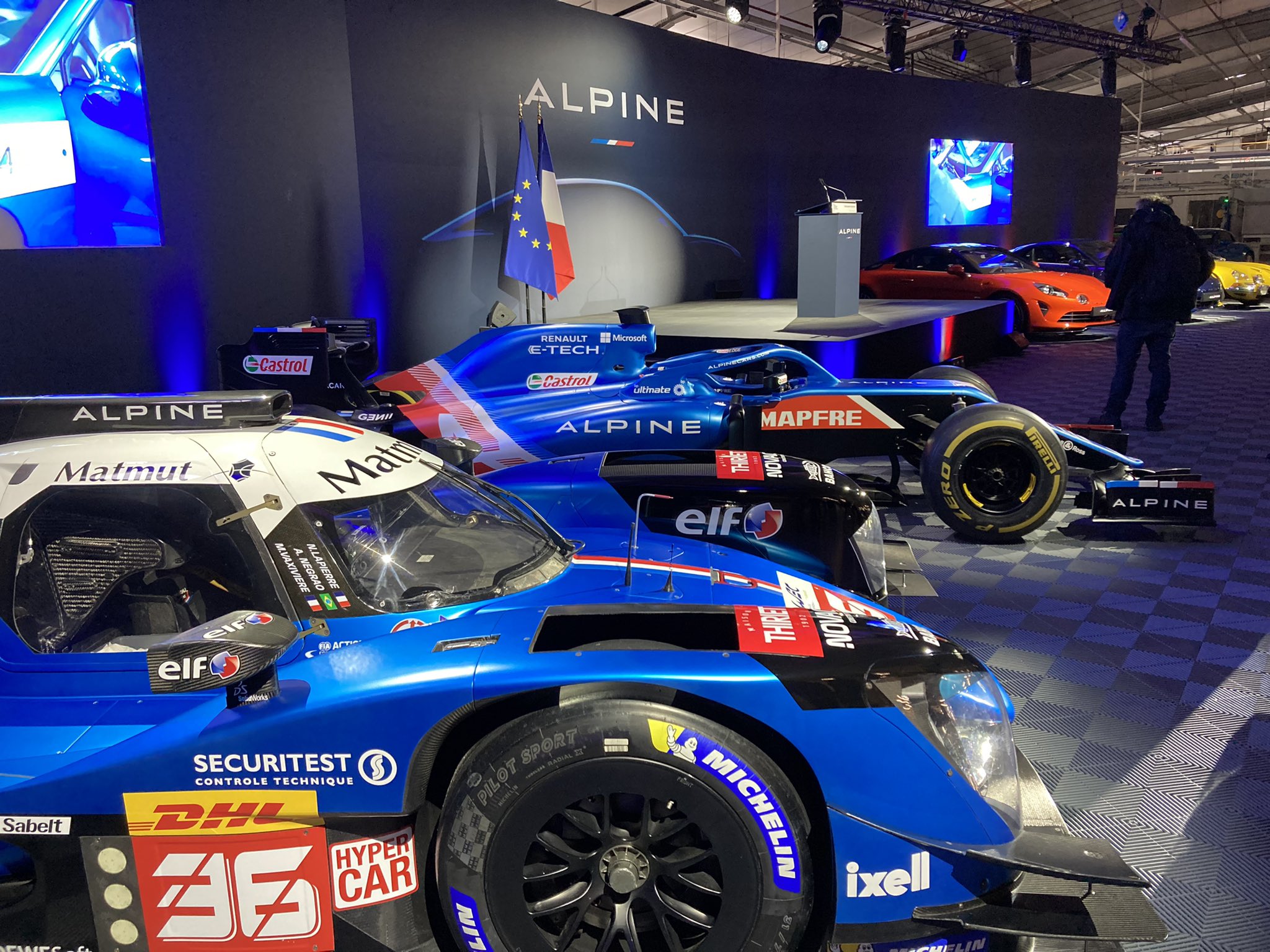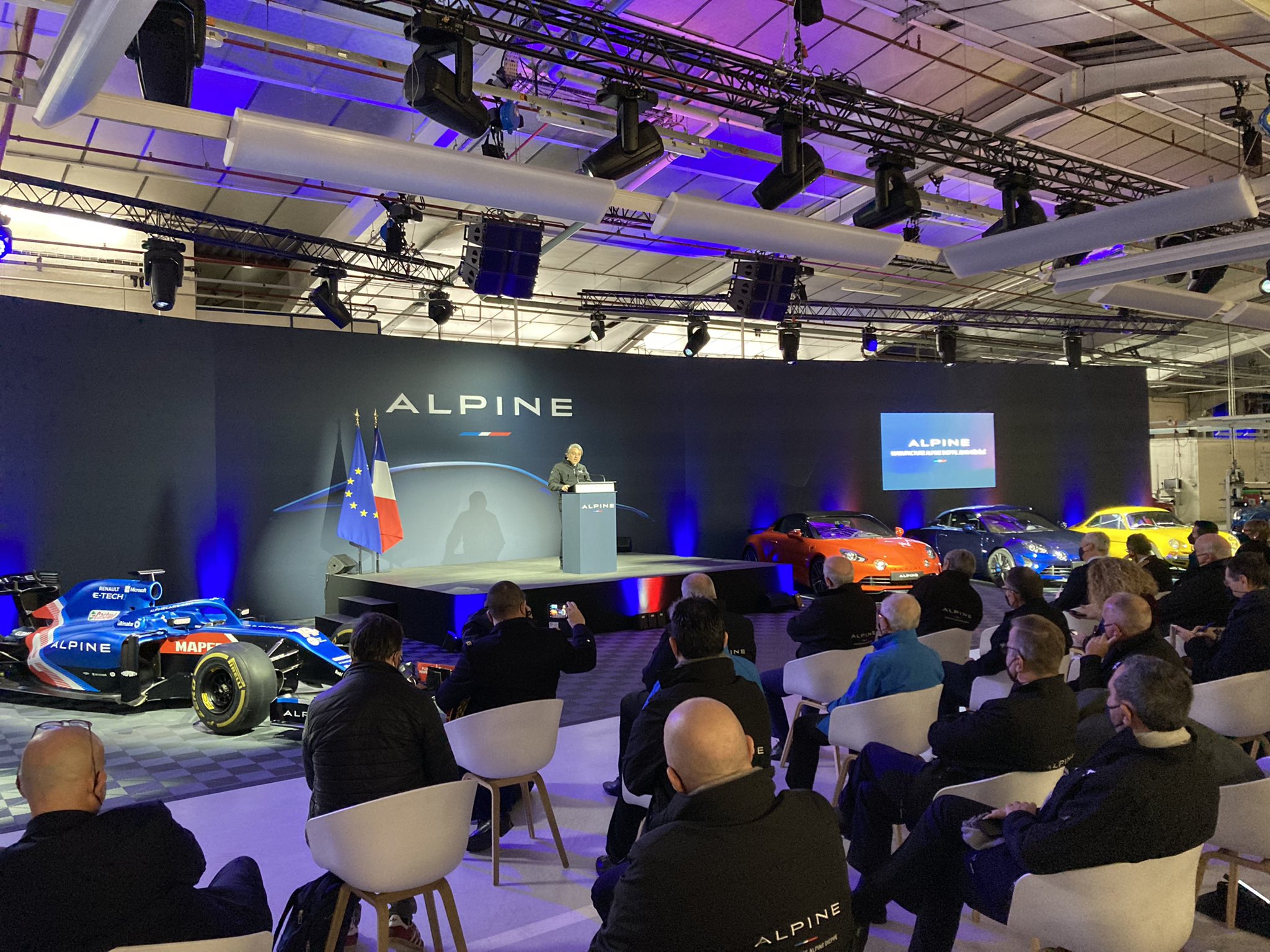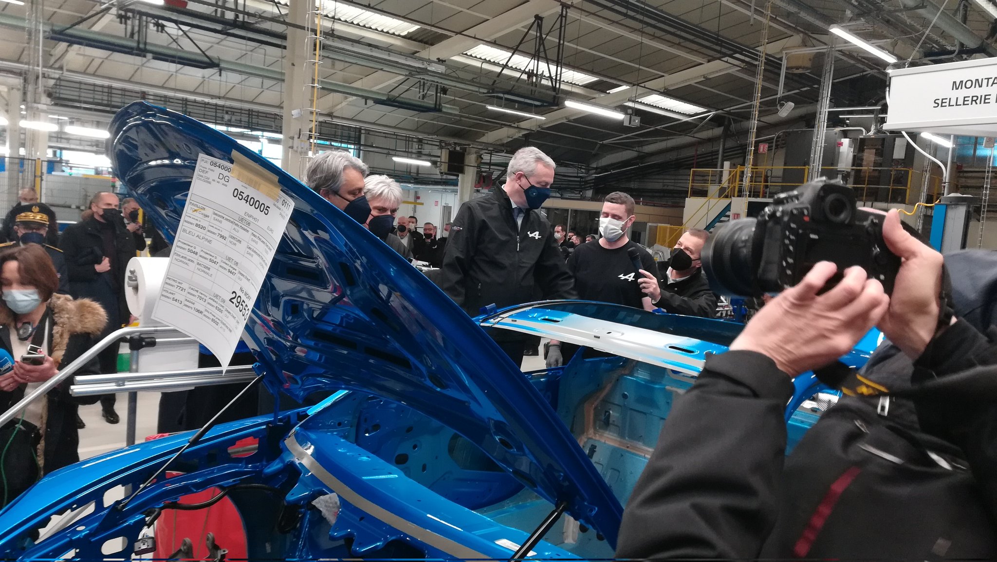 法国财长勒梅尔到访了Alpine总部,见证了公司首辆纯电动汽车下线,雷诺CEO LucaDe Meo和奥康陪同出席。