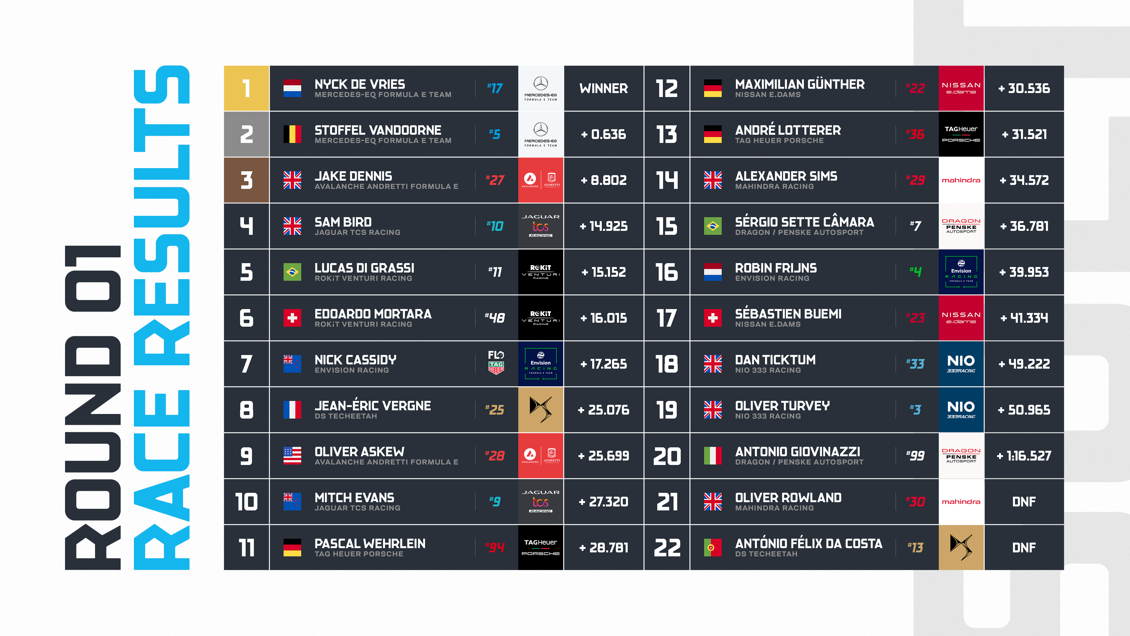 FE第八赛季第一场利雅得站比赛结束,梅赛德斯EQ车手德弗里斯获得冠军,队友范多恩取得第二名。领奖台上的另一位车手是安德雷蒂车队的杰克·丹尼斯。