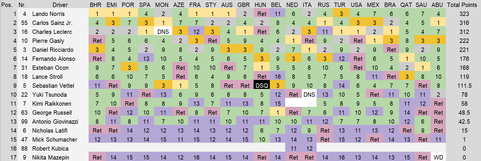 如此看来,诺里斯将是最终的赢家,并取得6场胜利。勒克莱尔也将以5胜排名第三。不过他的分数依然没有稳扎稳打的队友塞恩斯来得高。拉塞尔、加斯利、阿隆索和维特尔等也将成为“分站冠军”得主。