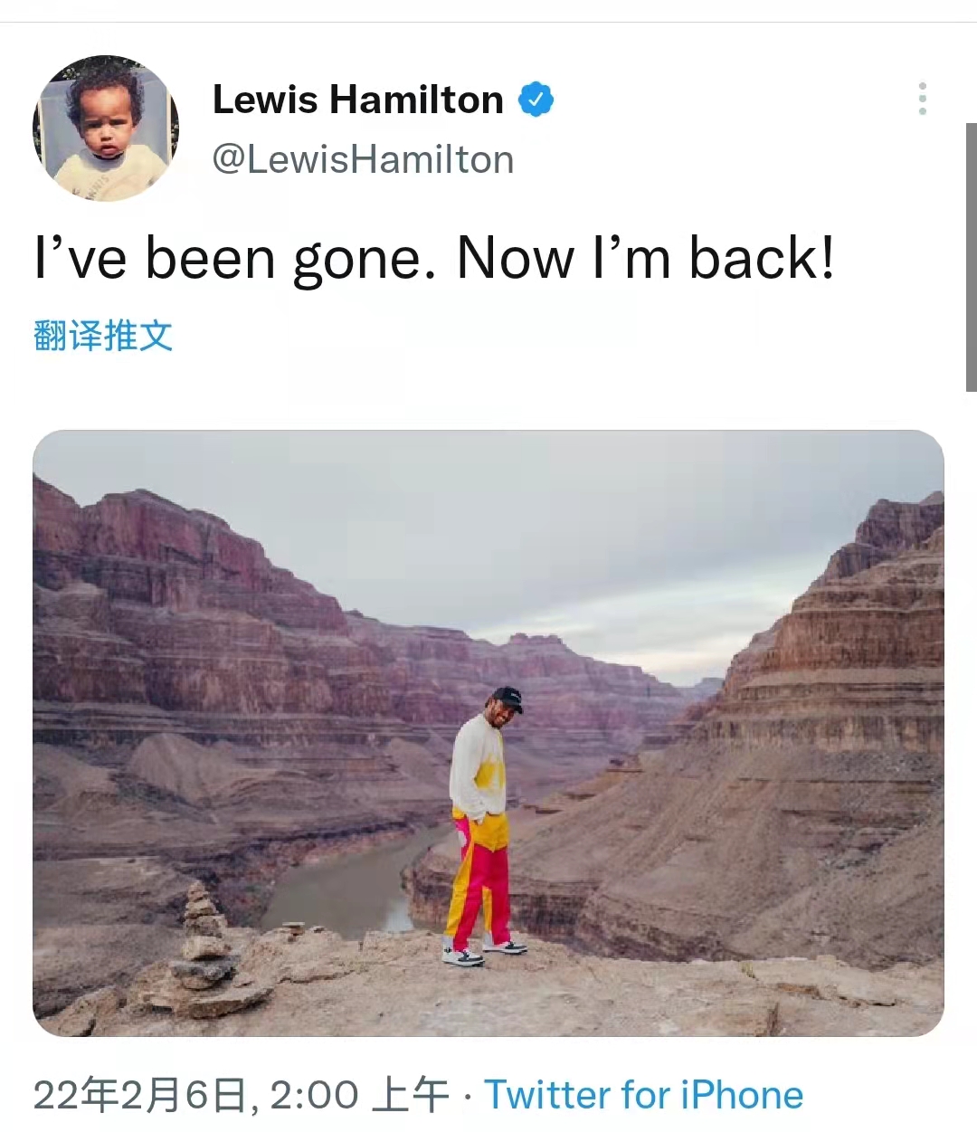 消失了8周之后,汉密尔顿终于再次更新了他的Twitter和Ins:I 've been gone. Now I'm back ( 我离开过。现在我回来了!)