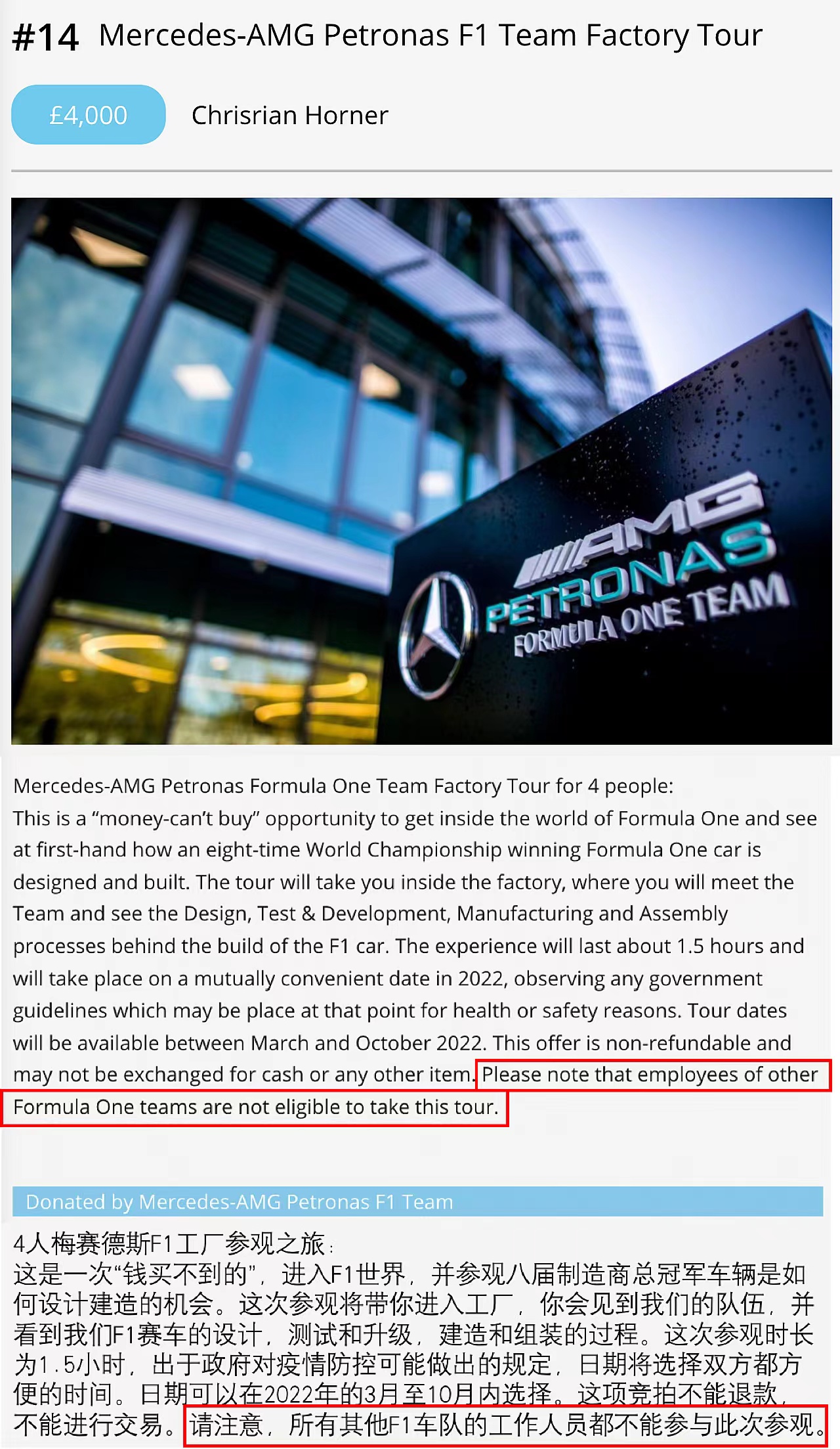 红牛领队霍纳近日竞拍了梅赛德斯F1车队的工厂参观权,并扬言“要带20个人”一起去参观。只不过梅赛德斯似乎早就对霍纳这种行为有所防备,不仅说明了参观“仅限四人”,甚至还在详情描述中注明,“其他F1车队的工作人员不能进行参观”。