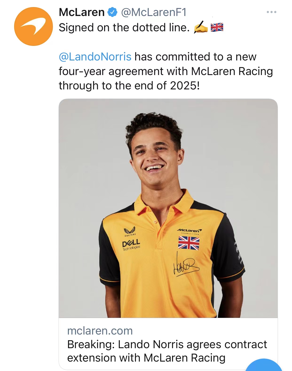 迈凯伦车队宣布和兰多·诺里斯达成了一份新的续约协议,合同到2025年底结束。过去的五年中,车队和诺里斯已经建立了良好的关系。
