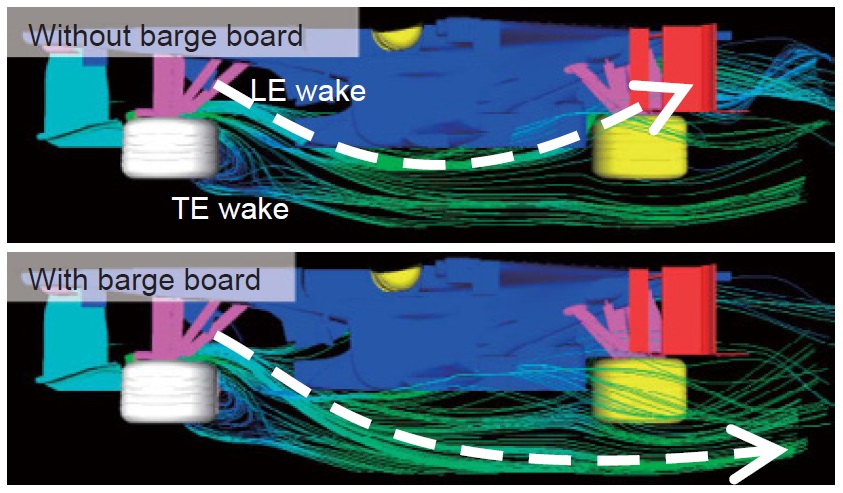 抵消上方涡流和下方涡流对于提升底板边缘下洗气流起到了有利的作用,此外它们还产生了向下合并的效果(类似于从尾翼对侧涡流产生的中心线上洗)。如同2017-2021年的赛车破风板设计,很容易看出破风板的用途,上半部分用于产生下洗气流,下半部分用于产生下压力。