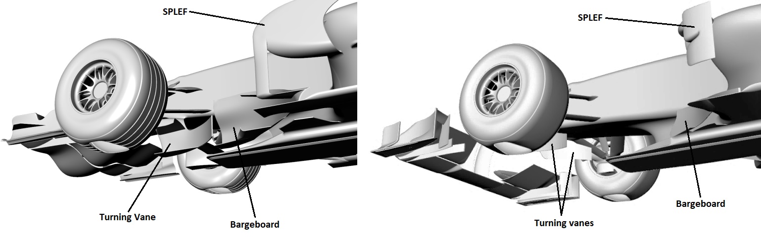 2009年的规则中,为了“清理”掉前胎周围的气流,减少下压力的同时减少整车气流复杂程度,规则上发生了剧烈的变动以减少破风板区域的整体效率。前胎周围设立了更大的“限制区域”禁止车身部分触及,使得破风板的体积大幅度减小。如此一来,车队纷纷将转向叶片放置在了距离轮胎侧面更近的位置,来减少对于前轮周围气流的影响。意外的是,车队发现了这里和新形成的前翼Y250区域形成了新的通路。这正好可以实现破风板的下洗作用。最终的结果的2009年的赛车下压力损失普遍要比预期的小一些。当年的双层扩散器和外洗前翼端板也颠覆了规则最初的用意。