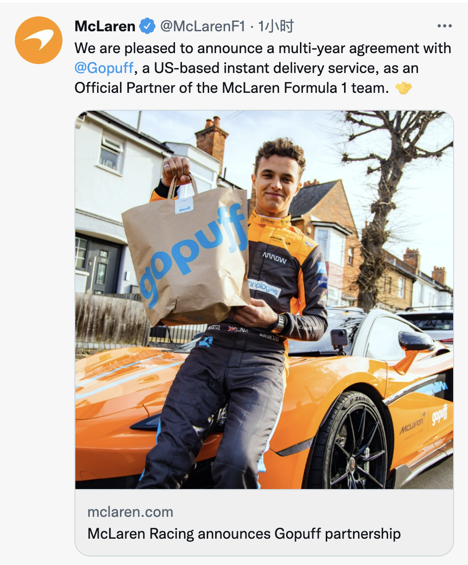 迈凯伦官宣,与美国外卖公司Gopuff达成了多年合作协议。