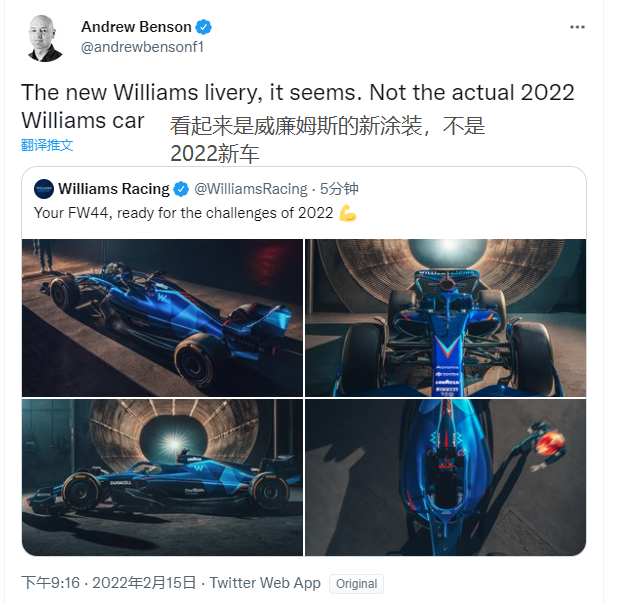 BBC记者:看起来是威廉姆斯的新涂装,不是2022新车。