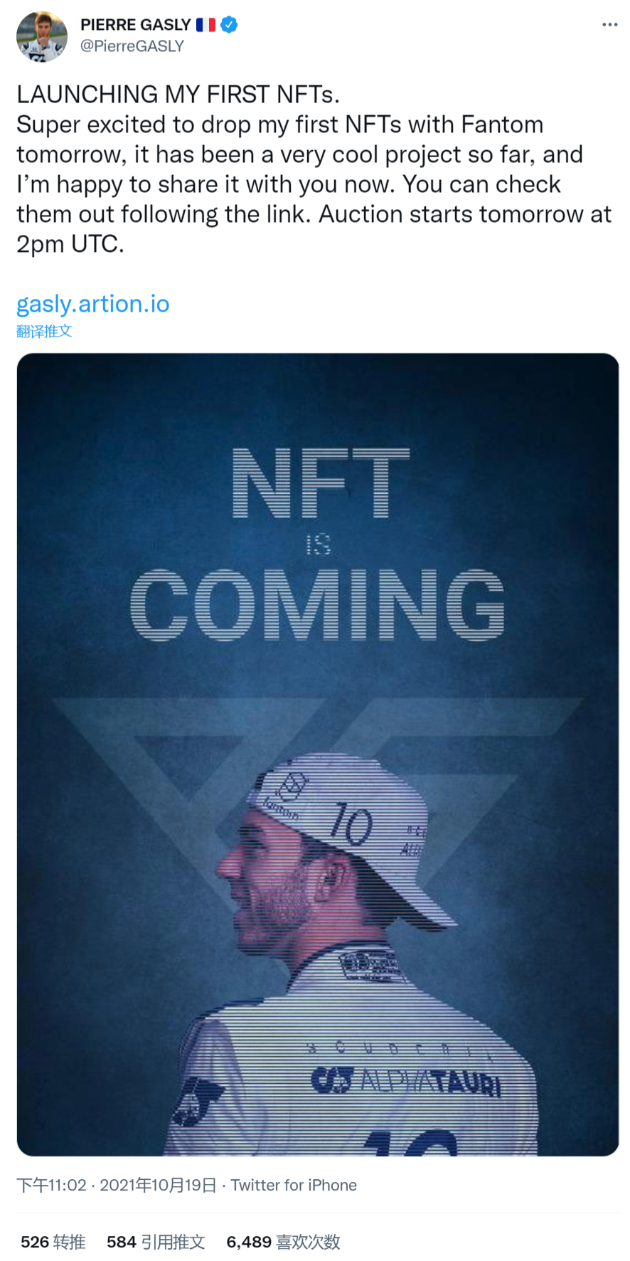 2021年10月19日,皮埃尔·加斯利在社交媒体公布消息,宣布将发行自己第一个NFTs。同时,他也是第一位提供NFT的F1车手。