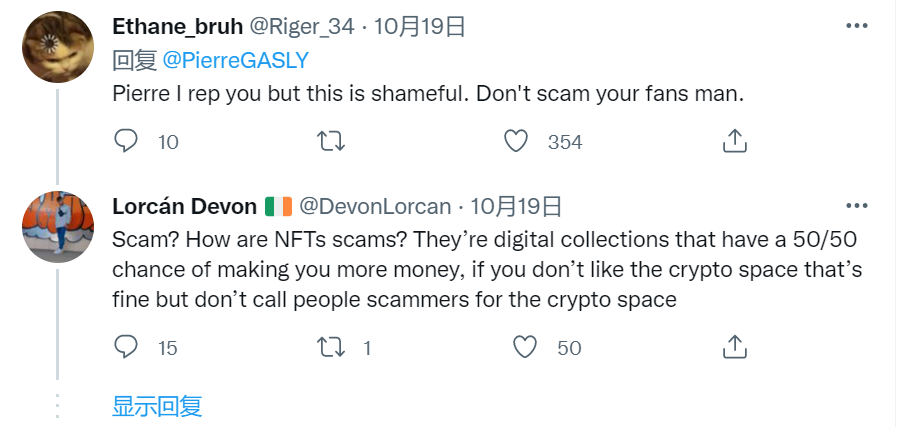 有加斯利的粉丝在他推特下留言说:“加斯利,这是可耻的!不要欺骗你的粉丝!”这条留言获得了超300次点赞,但也有人回复:“你可以不喜欢,但不能称之为骗局。”