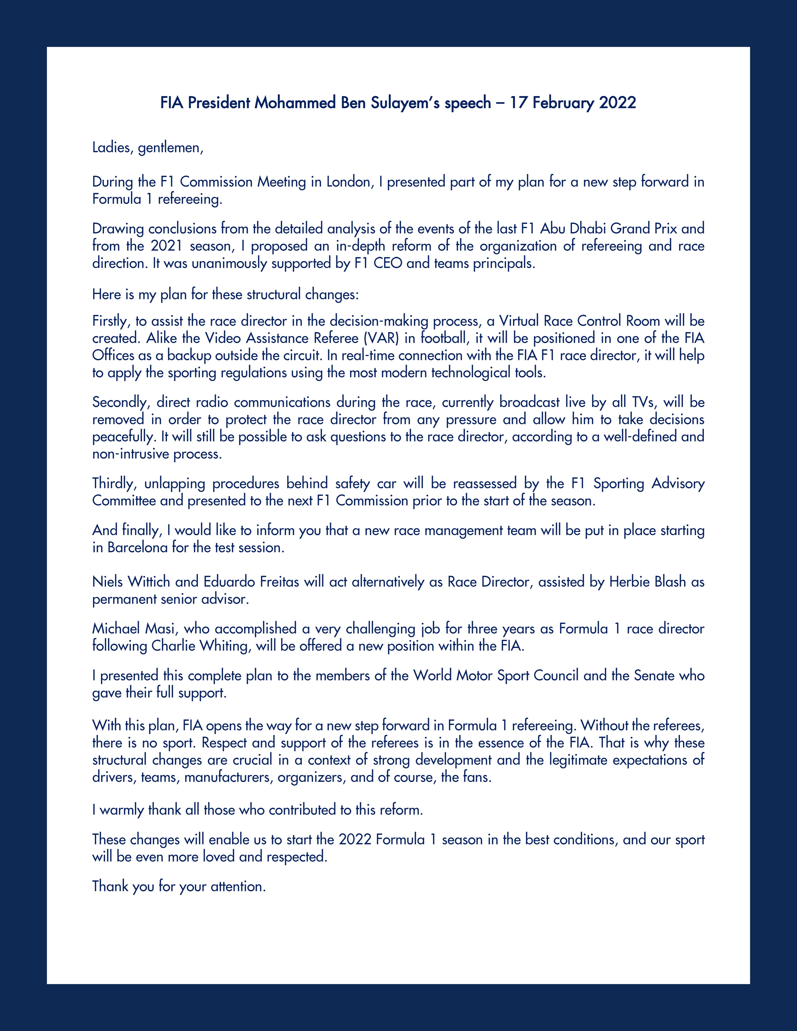 同时,FIA也宣布,爱德华多·弗雷塔斯(Eduardo Freitas)和尼尔斯·维蒂奇(Niels Wittich)将交替担任F1赛事总监,由赫比·布拉什(Herbie Blash)担任常务高级顾问。