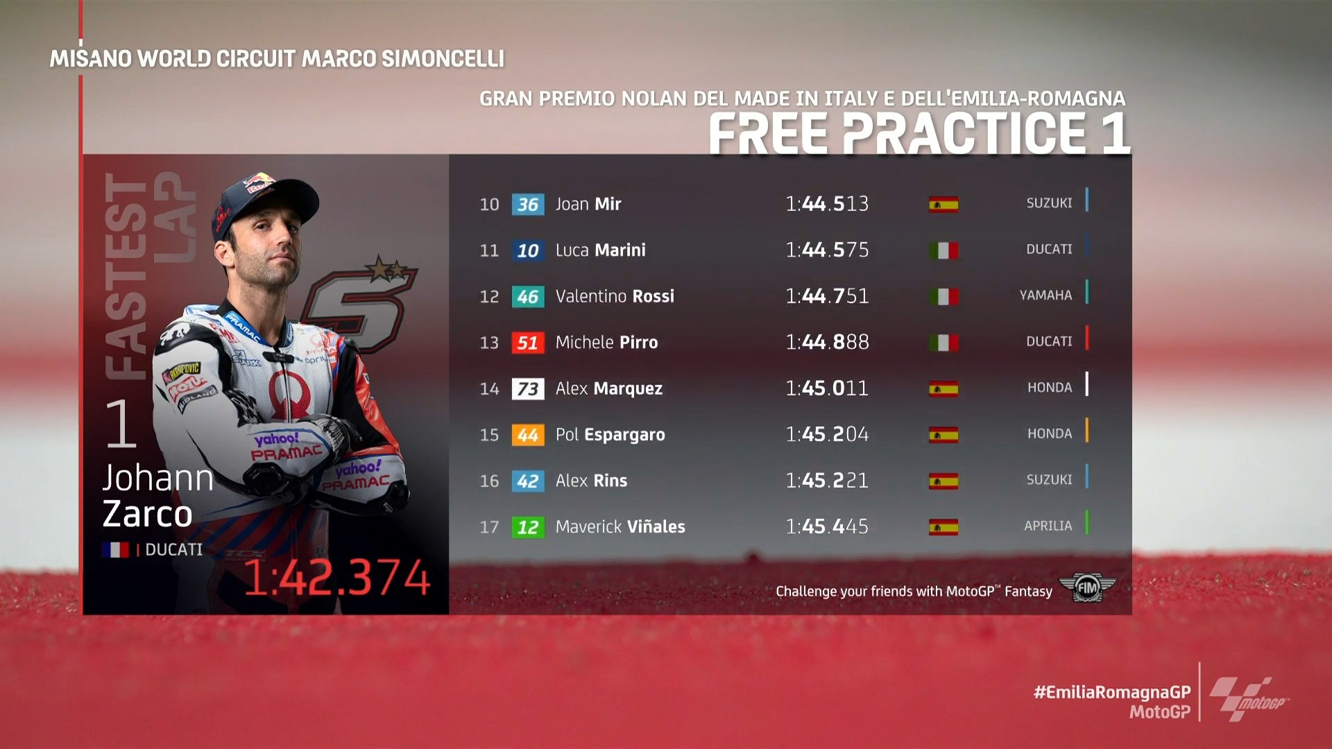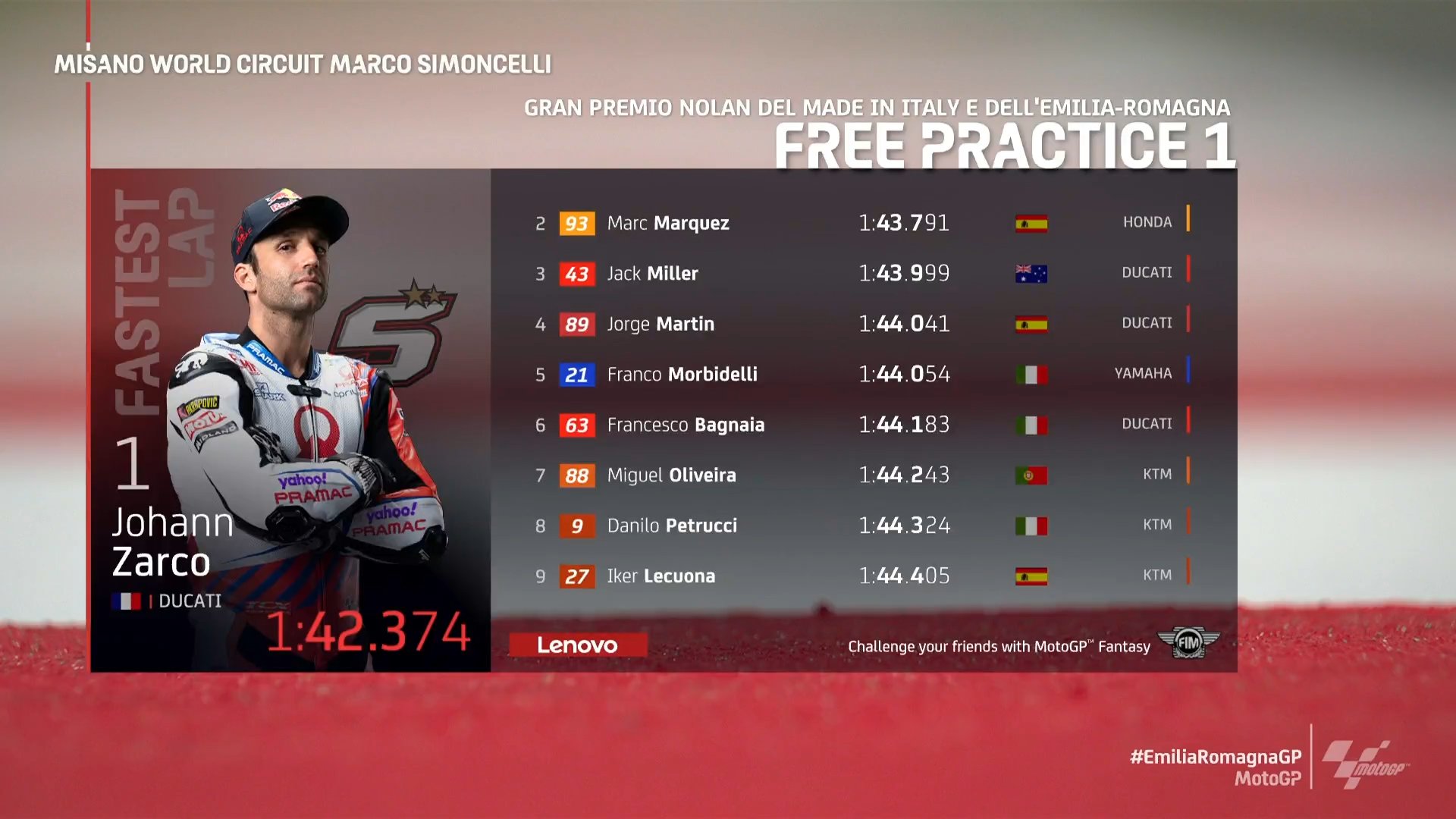 在刚刚结束的MotoGP艾米利亚罗马涅站第一次自由练习赛中,Pramac杜卡迪车队的约翰·扎科取得最快,本田厂队的马克·马奎兹位列第二,杜卡迪车队的米勒第三。两位冠军争夺者夸塔拉罗和巴尼亚亚都遇到了不小的麻烦:雅马哈的夸塔拉罗整节练习赛都节奏不佳,仅列第18位;米勒的队友巴尼亚亚则在8号弯遭遇摔车,最终排在第6位。