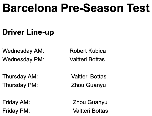 阿尔法罗密欧车队公布了他们本周在加泰罗尼亚冬测的车手安排,在三天的测试中,中国车手周冠宇将于当地时间周四下午2点-6点和周五上午9点到13点进行测试。加泰罗尼亚时间比北京时间晚7小时,周冠宇登场时间为周四晚上9点和周五下午4点。