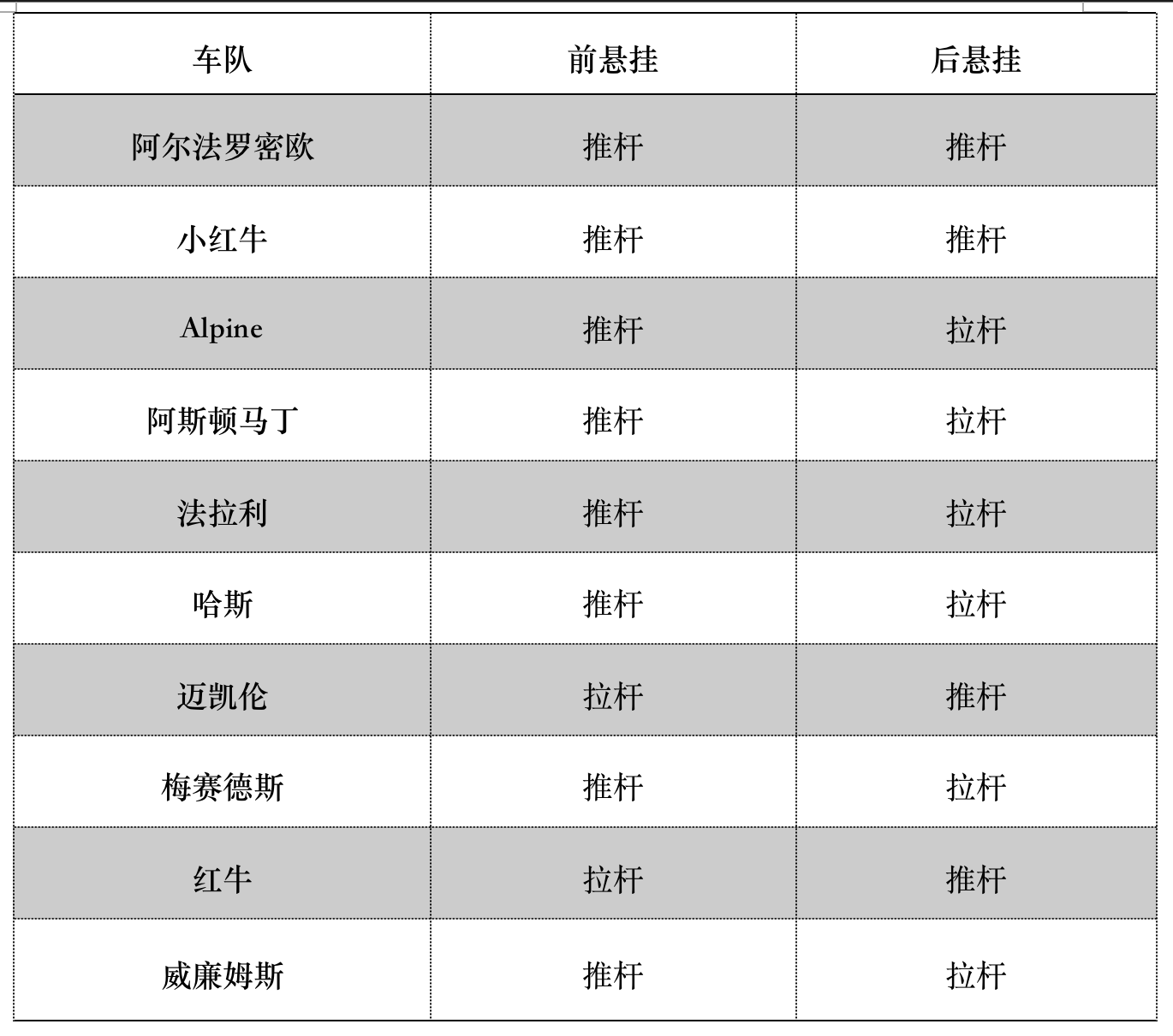 在2022年的赛车设计中,不同的车队选择了不同种类的前后悬挂。来看一下各支车队悬挂选择的总结吧!