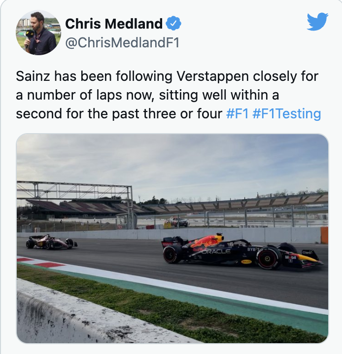据F1记者Chris Medland报道,在过去的三到四圈当中,塞恩斯一直紧紧跟在维斯塔潘身后一秒以内的位置上。