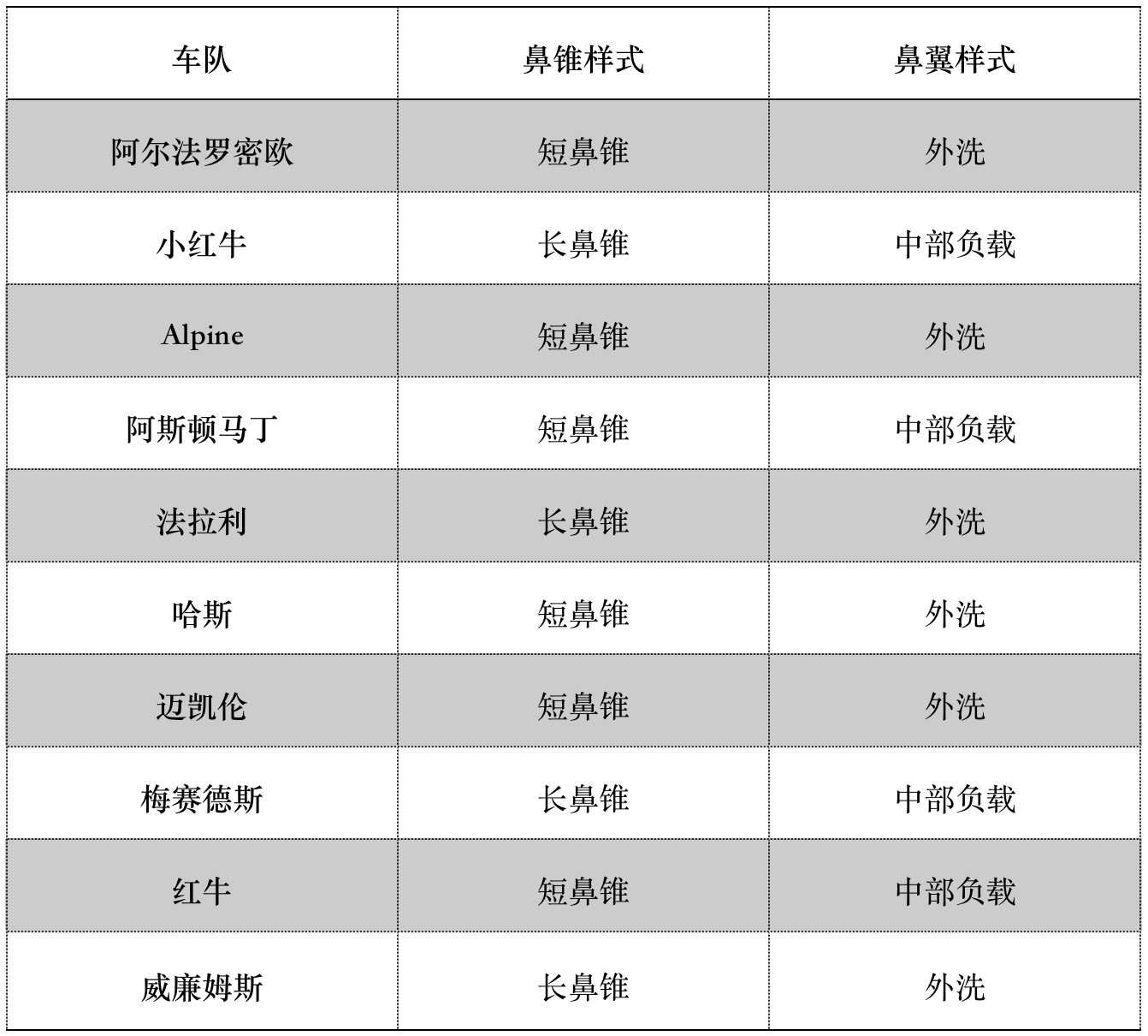 2022年各支车队的赛车设计中,鼻翼和鼻锥的样式也有着不同的区分。f1technical网站根据鼻锥的长短和鼻翼的样式,对各支车队做了总结。