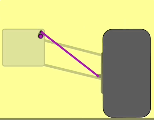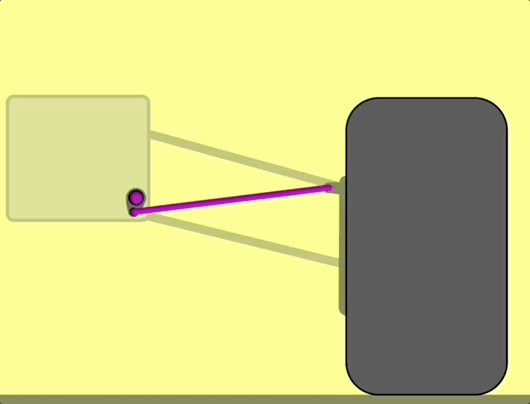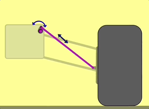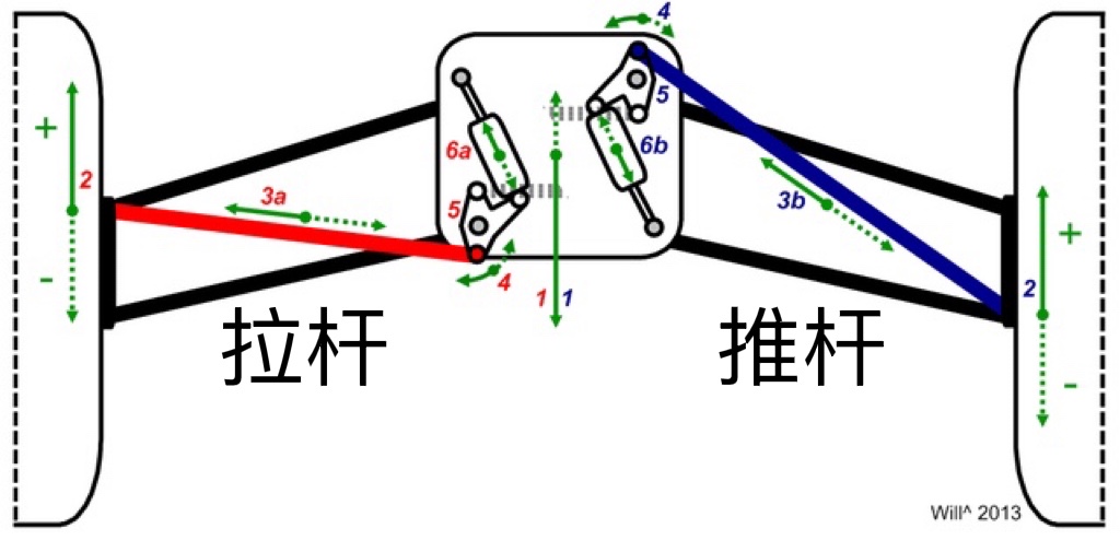 当轮胎受到颠簸弹起时,力量会通过推杆,将摇杆向内推,最终抵消。