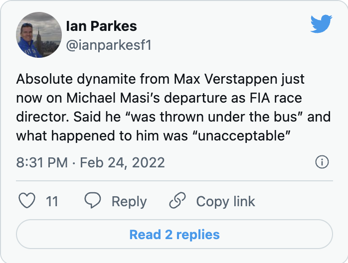 在正在举行的发布会上,维斯塔潘表示,马西被像“扔下公交车”一样离职,是完全不可接受的。