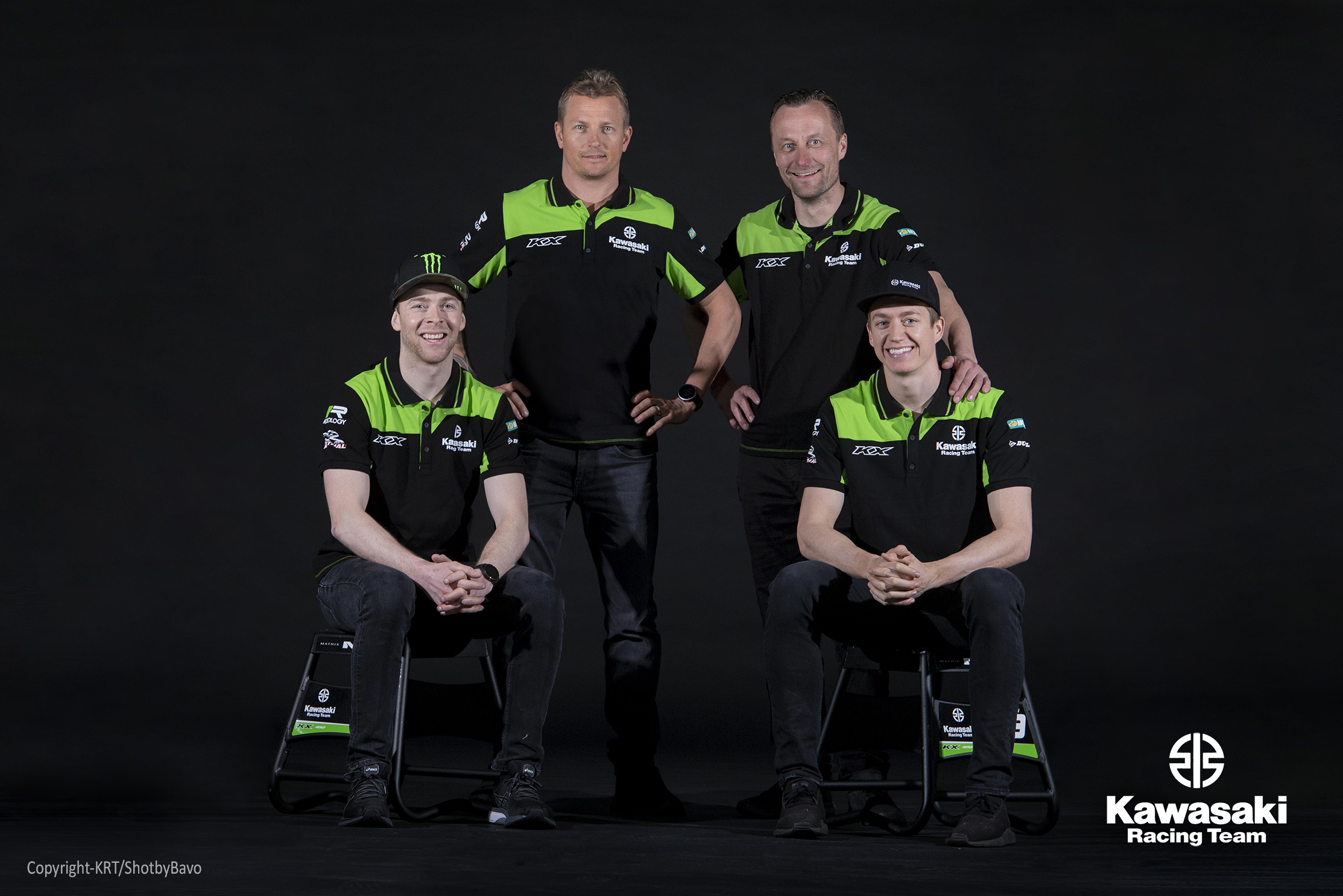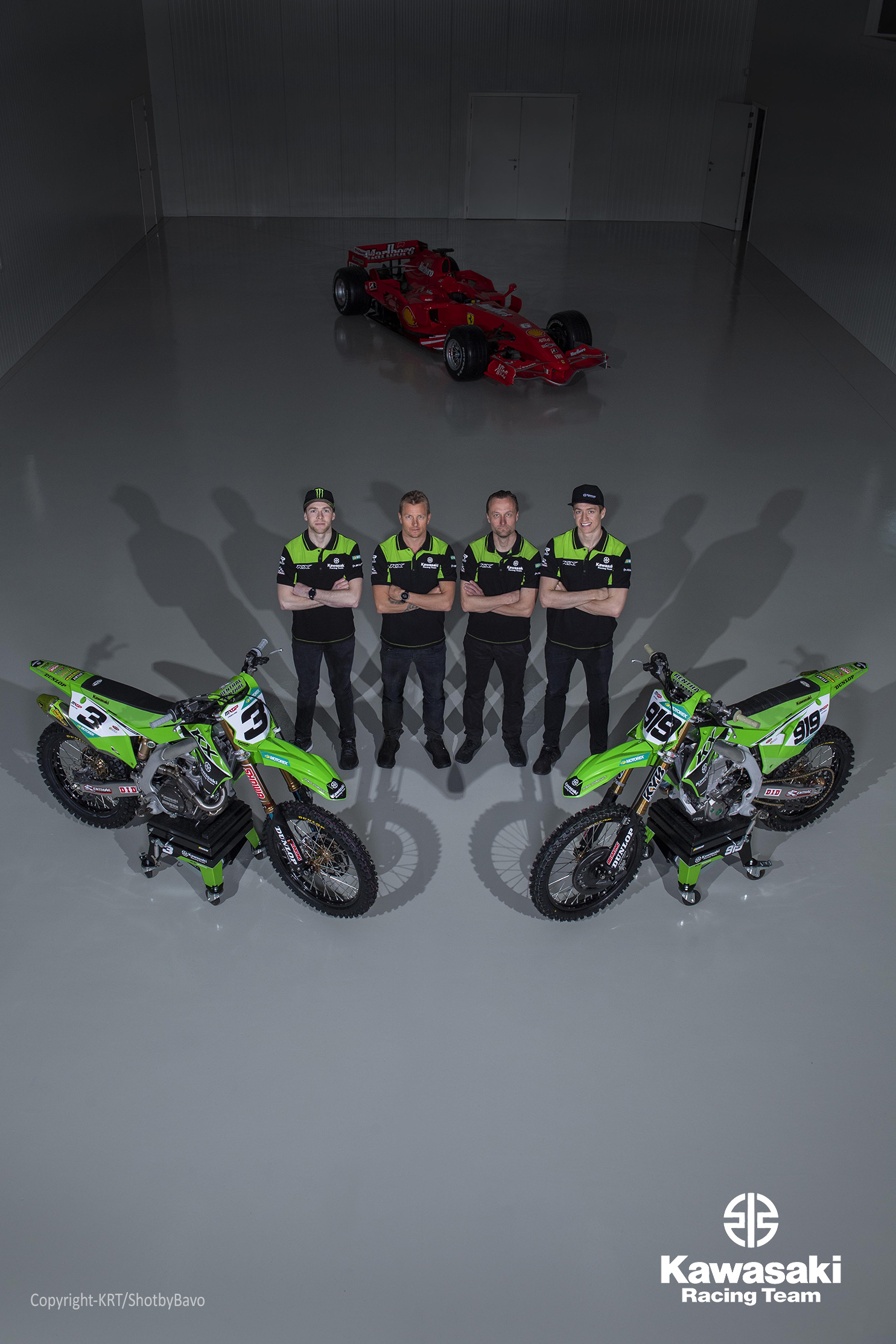 川崎越野摩托车队发布照片,除了车手之外,作为老板的莱科宁也出现在其中,身后还有一辆法拉利F2007赛车,当年莱科宁就是驾驶此车获得了世界冠军。