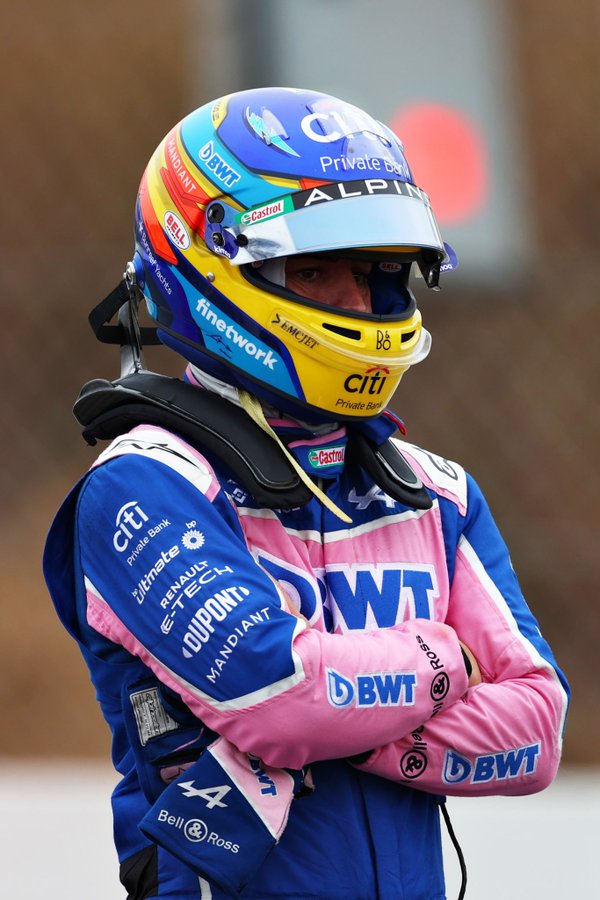 赛车着火之后,阿隆索只能在一旁无奈地抱手,看向自己的车。