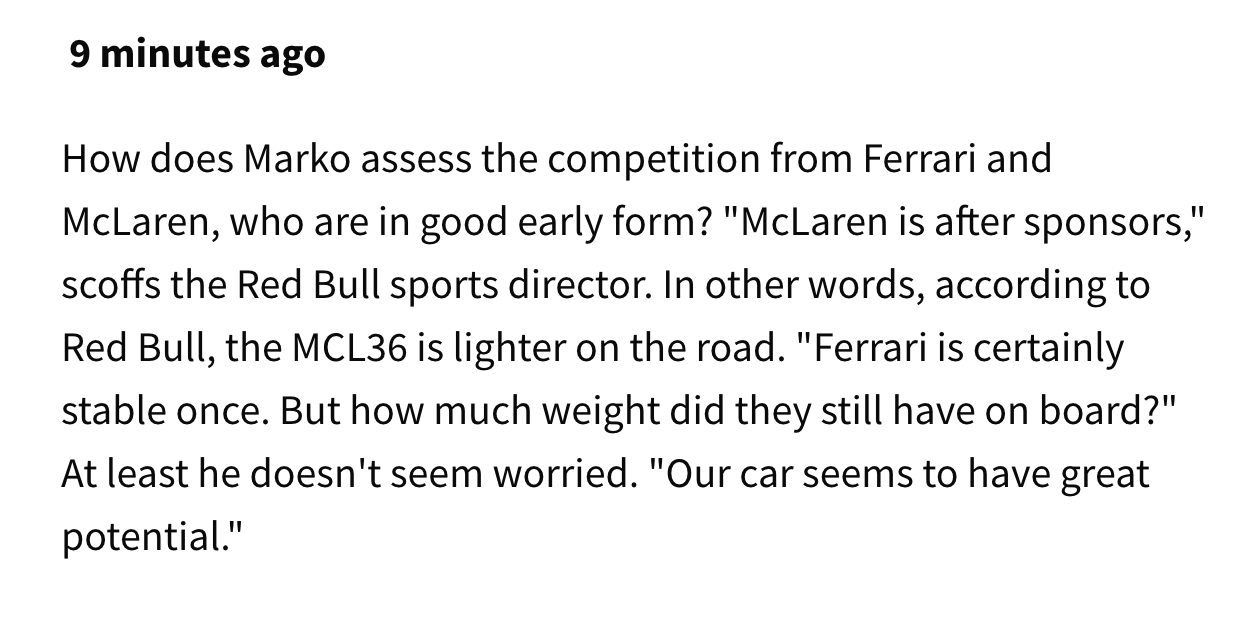 红牛顾问马尔科博士在接受采访时谈到了竞争对手迈凯伦和法拉利:“与红牛相比,MCL36重量更轻,法拉利更稳定。他们都有进步空间,而我们潜力最大。”