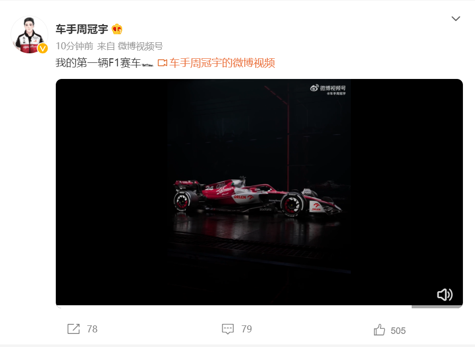 随后周冠宇也发布了新车视频,并说:“我的第一辆F1赛车”