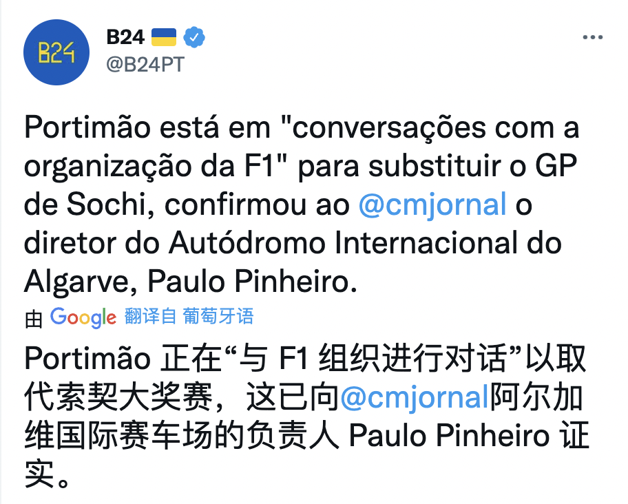 据B24体育报道,葡萄牙波尔蒂芒正与F1官方接触,准备取代俄罗斯索契大奖赛。葡萄牙发行量最大的日报《晨邮报》,已经向波尔蒂芒的阿尔加维国际赛车场负责人Paulo Pinheiro确认了这一消息。