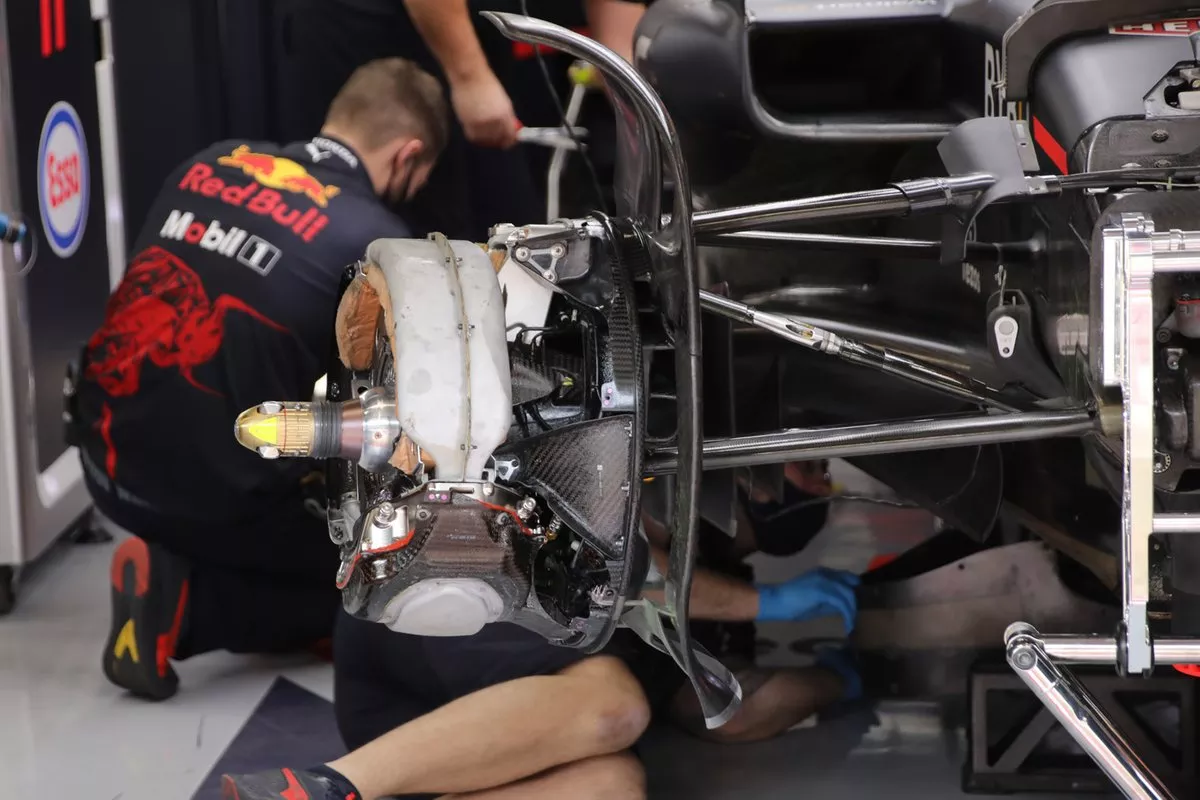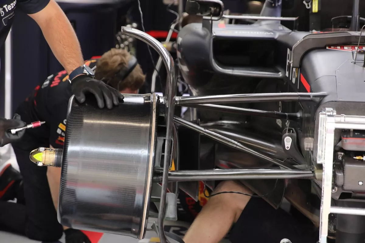 将目光继续聚焦在红牛身上,我们能够发现其前制动器组件并没有与刹车鼓直接连接。考虑到车队本赛季受到的新规约束,这为我们揭示了一些有趣的小细节。
