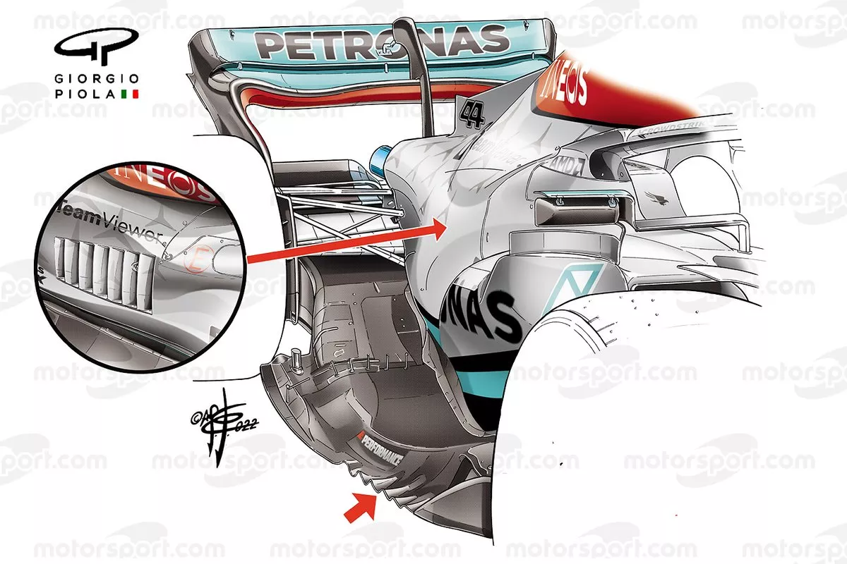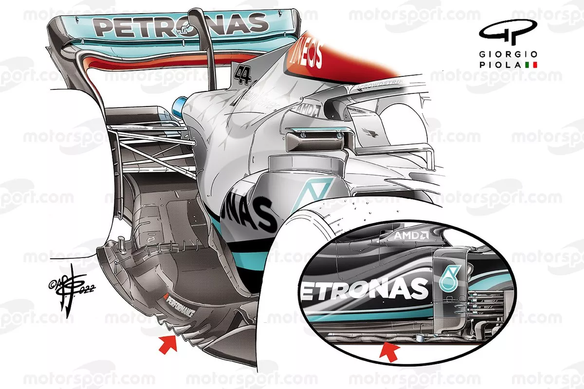 然而在其他车队纷纷引入更为复杂的底板边缘设计,例如切口设计和独立翼片,用以增强底板下部密封性并梳理后轮乱流时,梅奔并没有选择随波逐流。