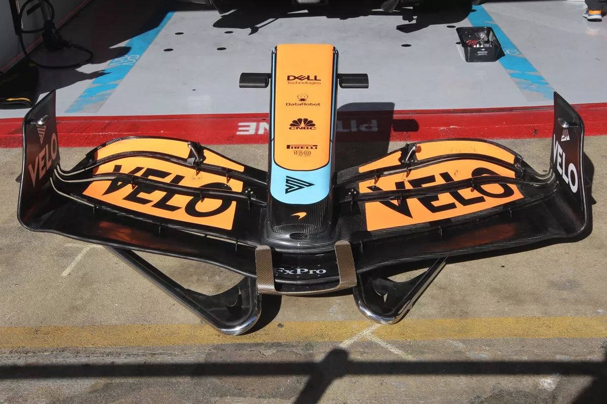 迈凯伦在发布MCL36时展示了两个不同版本的前翼,渲染图和实际的版本区别很大。但很明显,测试车上的版本才是更接近最终形态的,否则也不需要使用胶带来遮盖部分细节。